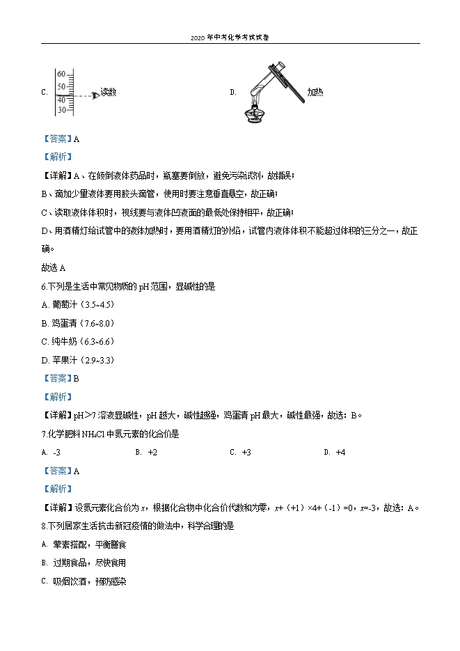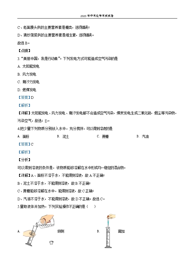 【内容简介】一、选择题1.下列属于物理变化的是A. 钢铁生锈B. 纸张燃烧C. 冰雪融化D. 粮食酿酒【答案】C【解析】【详解】A、钢铁生锈,生成了新物质属于化学变化,不符合题意。B、纸张燃烧,生成了二氧化碳等物质,属于化学变化,不符合题意。C、冰雪融化是物质状态的变化,没有生成新物质,属于物理变化,符合题意。D、粮食酿酒,生成了酒精,属于化学变化,不符合题意。故选:C。2.下列美食富含油脂的是A. 水煮豆腐B. 红烧猪肉C 老面馒头D. 清炒菠菜【答案】B【解析】【详解】A、水煮豆腐提供的主要营养素是蛋白质,选项错误;B、红烧猪肉供的主要营养素是油脂,选项正确C、老面馒头供的主要营养素是糖类,选项错误;D、清炒菠菜供的主要营养素是维生素,选项错误。故选B。【点睛】3.“美丽中国,我是行动者”。下列发电方式可能造成空气污染的是A. 太阳能发电B. 风力发电C. 潮汐力发电D. 燃煤发电【答案】D【解析】【详解】太阳能发电、风力发电、潮汐发电都不会造成空气污染,煤炭发电生成二氧化硫,烟尘等污染物,污染空气,故选:D。4.把少量下列物质分别放入水中,充分搅拌,可以得到溶液的是A. 面粉B. 泥土C. 蔗糖D. 汽油【答案】C【解析】【分析】可以得到溶液的条件是,该物质能够溶解在水中形成均一稳定的混合物。【详解】A、面粉不溶于水,不能得到溶液,故A不正确;B、泥土不溶于水,不能得到溶液,故B不正确;C、蔗糖能够溶解在水中,能得到溶液,故C正确;D、汽油不溶于水,不能得到溶液,故D不正确。故选C。5.量取液体并加热,下列实验操作不正确的是( ).......
