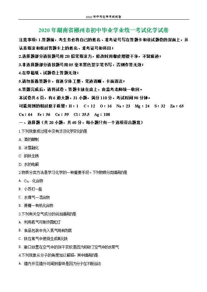 湖南省郴州市2020年初中毕业学业统一考试化学试卷(原卷版)