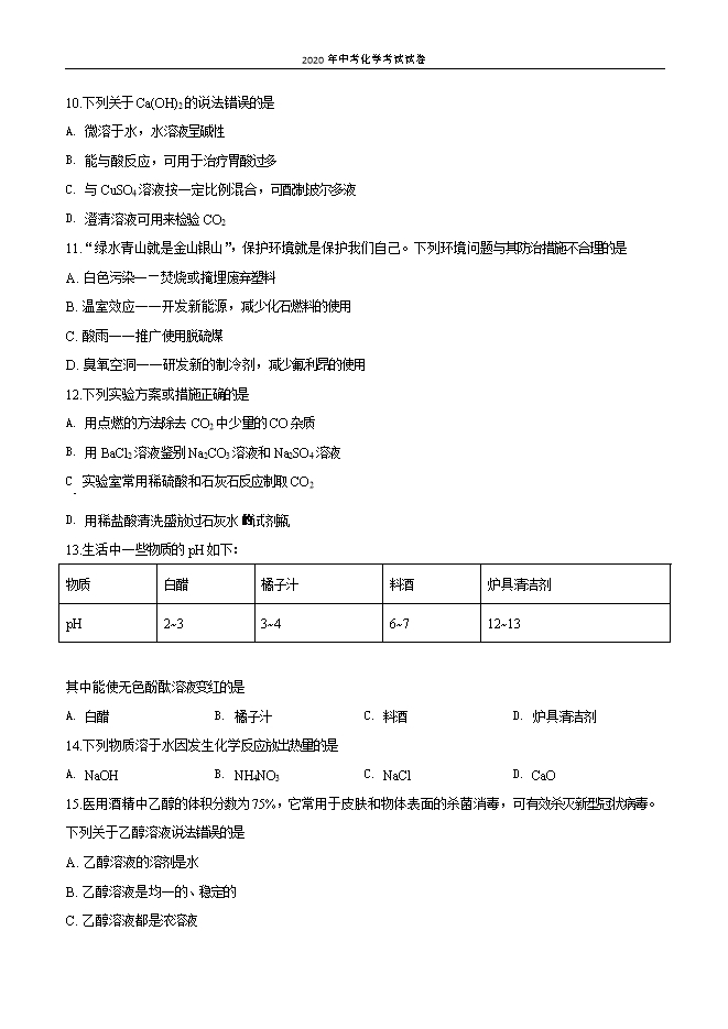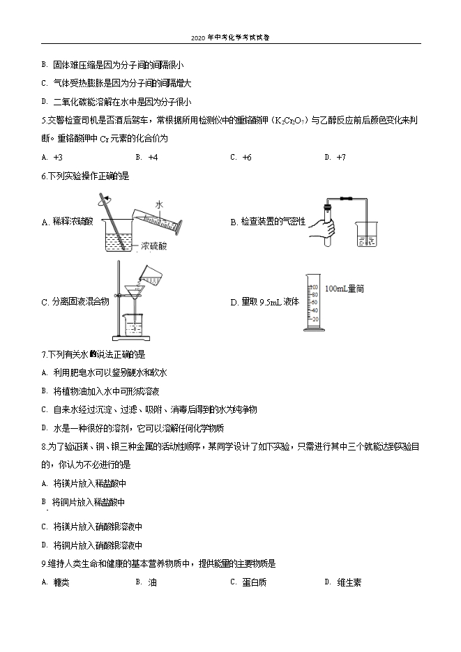 【内容简介】一、选择题(共20小题,共40分,每小题只有一个选项符合题意)1.下列现象或过程中没有涉及化学变化的是A. 酒的酿制B. 冰雪融化C. 钢铁生锈D. 水的电解2.物质分类方法是学习化学的一种重要手段。下列物质分类错误的是A. C60一化合物B. 小苏打一盐C. 水煤气一混合物D. 蔗糖一有机化合物3.下列有关空气成分的说法错误的是A. 利用氦气可制作霓虹灯B. 食品包装中充入氮气用来防腐C. 铁在氧气中燃烧生成氧化铁D. 敞口放置在空气中的饼干变软是因为吸收了空气中的水蒸气4.下列现象从分子的角度加以解释,其中错误的是A. 墙内开花墙外可闻到香味是因为分子在不断运动B. 固体难压缩是因为分子间的间隔很小C. 气体受热膨胀是因为分子间的间隔增大D. 二氧化碳能溶解在水中是因为分子很小5.交警检查司机是否酒后驾车,常根据所用检测仪中的重铬酸钾(K2Cr2O7)与乙醇反应前后颜色变化来判断。重铬酸钾中Cr元素的化合价为A. +3B. +4C. +6D. +76.下列实验操作正确的是A. 稀释浓硫酸 B. 检查装置的气密性 C. 分离固液混合物 D. 量取9.5mL液体 7.下列有关水 说法正确的是A. 利用肥皂水可以鉴别硬水和软水B. 将植物油加入水中可形成溶液C. 自来水经过沉淀、过滤、吸附、消毒后得到的水为纯净物D. 水是一种很好的溶剂,它可以溶解任何化学物质8.为了验证镁、铜、银三种金属的活动性顺序,某同学设计了如下实验,只需进行其中三个就能达到实验目的,你认为不必进行的是A. 将镁片放入稀盐酸中B 将铜片放入稀盐酸中C. 将镁片放入硝酸银溶液中D. 将铜片放入硝酸银溶液中9.维持人类生命和健康的基本营养物质中,提供能量的主要物质是A. 糖类B. 油C. 蛋白质D. 维生素......
