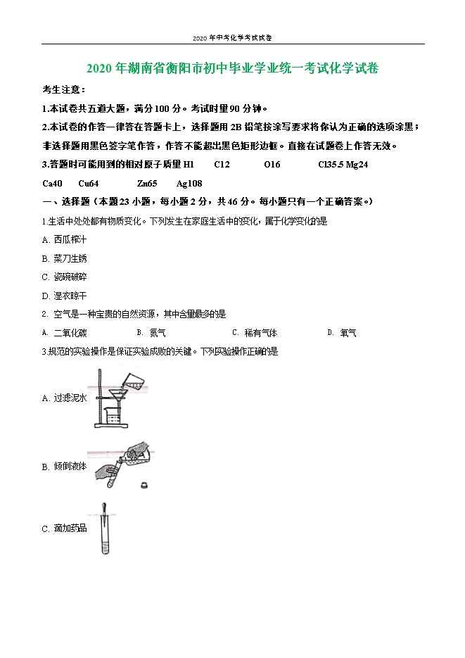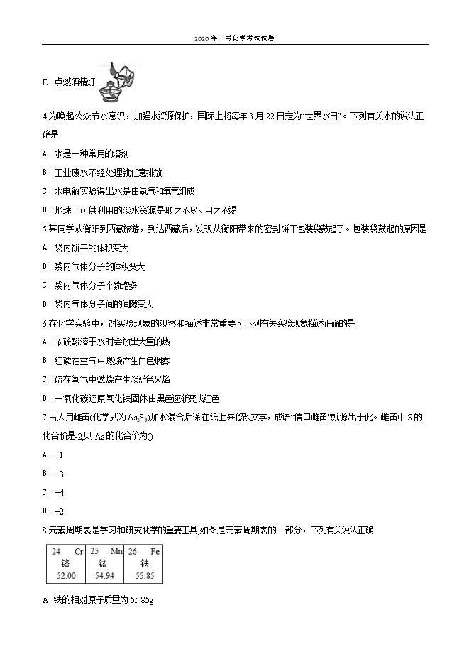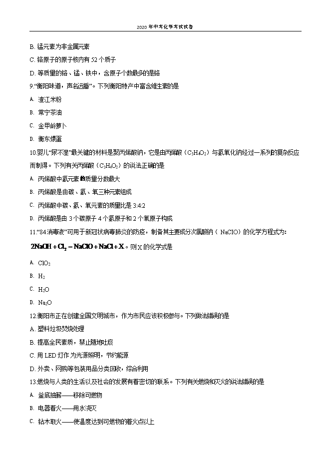 湖南省衡阳市2020年初中毕业学业统一考试化学试卷(原卷版)