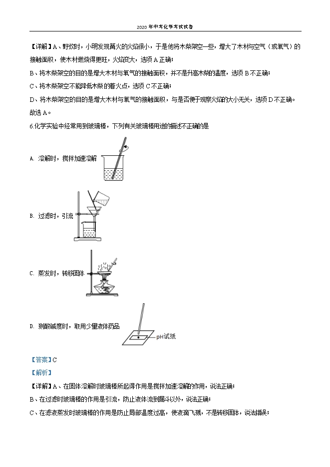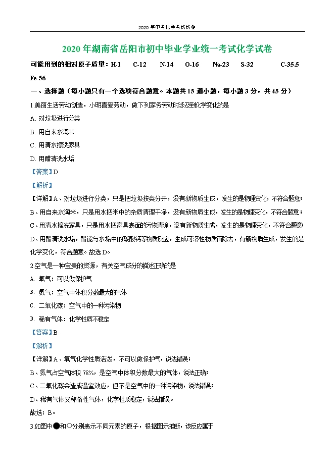 湖南省岳阳市2020年初中毕业学业统一考试化学试卷(解析版)