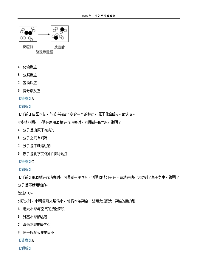 【内容简介】一、选择题(每小题只有一个选项符合题意。本题共15道小题,每小题3分,共45分)1.美丽生活劳动创造,小明喜爱劳动,做下列家务劳动时涉及到化学变化的是A. 对垃圾进行分类B. 用自来水淘米C. 用清水擦洗家具D. 用醋清洗水垢【答案】D【解析】【详解】A、对垃圾进行分类,只是把垃圾按类分开,没有新物质生成,发生的是物理变化,不符合题意;B、用自来水淘米,只是用水把米中的杂质清理干净,没有新物质生成,发生的是物理变化,不符合题意;C、用清水擦洗家具,只是用水把家具表面的污物清除,没有新物质生成,发生的是物理变化,不符合题意;D、用醋清洗水垢,醋能与水垢中的碳酸钙等物质反应,生成可溶性物质而除去,有新物质生成,发生的是化学变化,符合题意。故选D。2.空气是一种宝贵的资源,有关空气成分的描述正确的是A. 氧气:可以做保护气B. 氮气:空气中体积分数最大的气体C. 二氧化碳:空气中的一种污染物D. 稀有气体:化学性质不稳定【答案】B【解析】【详解】A、氧气化学性质活泼,不可以做保护气,说法错误;B、氮气占空气体积78%,是空气中体积分数最大的气体,说法正确;C、二氧化碳会造成温室效应,但不是空气中的一种污染物,说法错误;D、稀有气体又称惰性气体,化学性质稳定,说法错误。故选:B。3.如图中 和 分别表示不同元素的原子,根据图示推断,该反应属于 A. 化合反应B. 分解反应C. 置换反应D. 复分解反应【答案】A【解析】【详解】由图可知,该反应符合“多变一”的特点,属于化合反应。故选A。4.疫情期间,小明在家用酒精进行消毒时,可闻到一股气味,说明了A. 分子是由原子构成的B. 分子之间有间隔C. 分子是不断运动的D. 原子是化学变化中的最小粒子【答案】C【解析】【详解】用酒精进行消毒时,可闻到一股气味,说明酒精分子在不断地运动,运动到了鼻子之中,说明了分子是不断运动的。故选:C。5.野炊时,小明发现火焰很小,他将木柴架空一些后火焰变大,架空的目的是A. 增大木柴与空气的接触面积B. 升高木柴的温度C. 降低木柴的着火点D. 便于观察火焰的大小