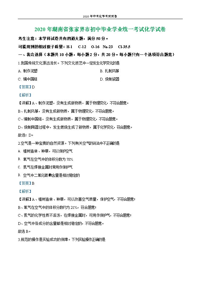 【内容简介】一、我会选择(本题共10小题,每小题2分,共20分。每小题只有一个选项符合题意)1.我国传统文化源远流长。下列文化技艺中一定发生化学变化的是A. 制作泥塑B. 扎制风筝C. 编中国结D. 烧制瓷器【答案】D【解析】【详解】A、制作泥塑,没有生成新物质,属于物理变化,不符合题意。B、扎制风筝,没有生成新物质,属于物理变化,不符合题意。C、编制中国结,没有生成新物质,属于物理变化,不符合题意。D、烧制陶器过程中,发生燃烧生成了新物质,属于化学变化,符合题意。故选:D。2.空气是一种宝贵的自然资源。下列有关空气的说法中不正确的是A. 植树造林、种草,可以保护空气B. 氧气在空气中的体积分数为78%C. 氮气在焊接金属时常用作保护气D. 空气中二氧化碳 含量是相对稳定的【答案】B【解析】【详解】A、植树造林、种草,可以改善空气质量,保护空气,不符合题意;B、氧气在空气中的体积分数约为21%,符合题意;C、氮气的化学性质不活泼,在焊接金属时,可用作保护气,不符合题意;D、空气中各成分的含量都是相对稳定的,不符合题意。故选B。3.规范的操作是实验成功的保障。下列实验操作正确的是......