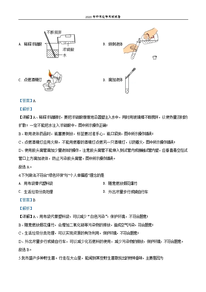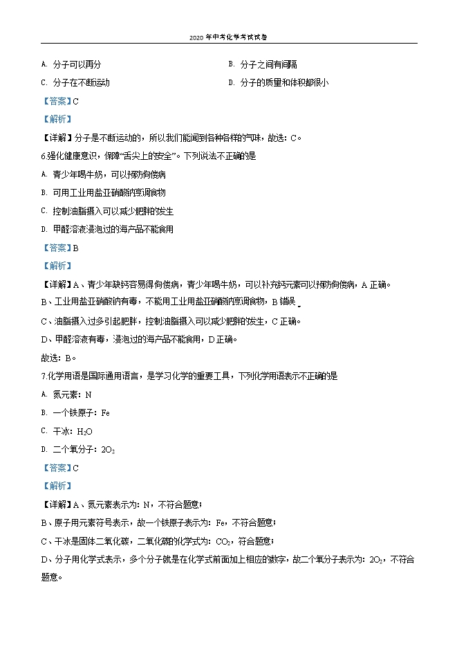 湖南省张家界市2020年初中毕业学业统一考试化学试卷(解析版)