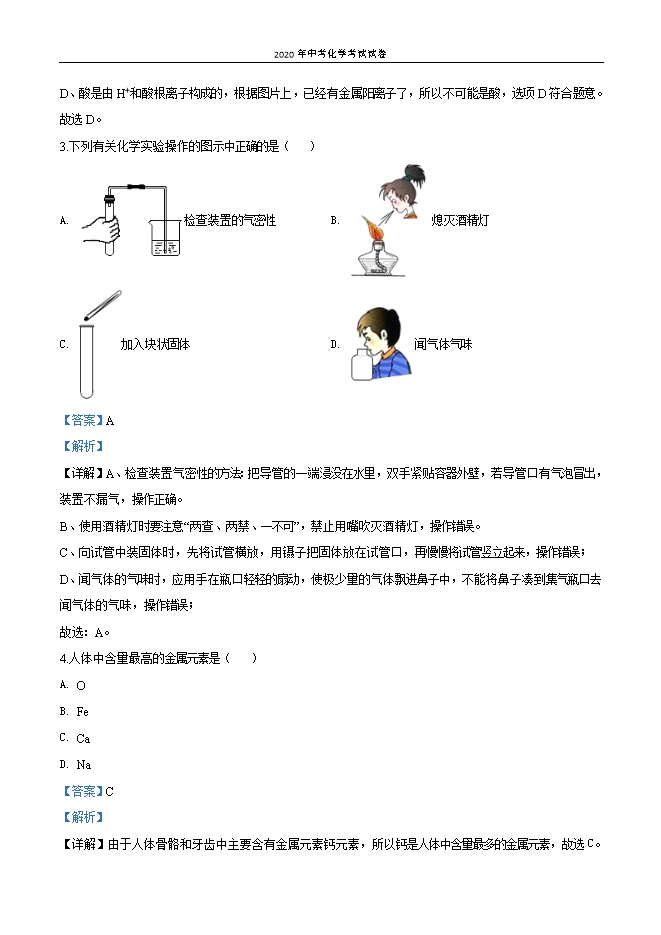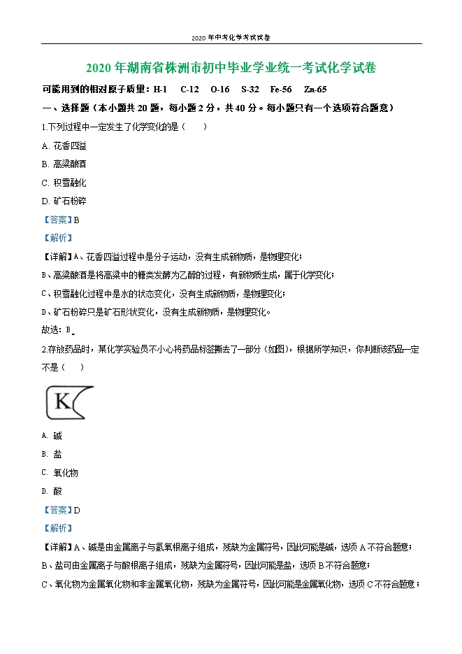 【内容简介】一、选择题(本小題共20题,每小题2分,共40分。每小题只有一个选项符合题意)1.下列过程中一定发生了化学变化的是( )A. 花香四溢B. 高粱酿酒C. 积雪融化D. 矿石粉碎【答案】B【解析】【详解】A、花香四溢过程中是分子运动,没有生成新物质,是物理变化;B、高粱酿酒是将高粱中的糖类发酵为乙醇的过程,有新物质生成,属于化学变化;C、积雪融化过程中是水的状态变化,没有生成新物质,是物理变化;D、矿石粉碎只是矿石形状变化,没有生成新物质,是物理变化。故选:B 2.存放药品时,某化学实验员不小心将药品标签撕去了一部分(如图),根据所学知识,你判断该药品一定不是( A. 碱B. 盐C. 氧化物D. 酸【答案】D【解析】【详解】A、碱是由金属离子与氢氧根离子组成,残缺为金属符号,因此可能是碱,选项A不符合题意;B、盐可由金属离子与酸根离子组成,残缺为金属符号,因此可能是盐,选项B不符合题意;C、氧化物为金属氧化物和非金属氧化物,残缺为金属符号,因此可能是金属氧化物,选项C不符合题意;D、酸是由H+和酸根离子构成的,根据图片上,已经有金属阳离子了,所以不可能是酸,选项D符合题意。故选D。3.下列有关化学实验操作的图示中正确的是( )......