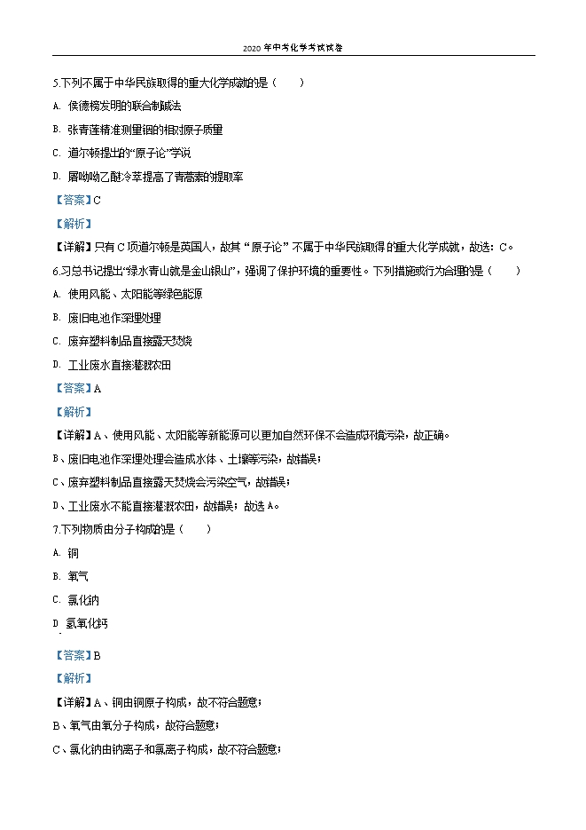 湖南省株洲市2020年初中毕业学业统一考试化学试卷(解析版)
