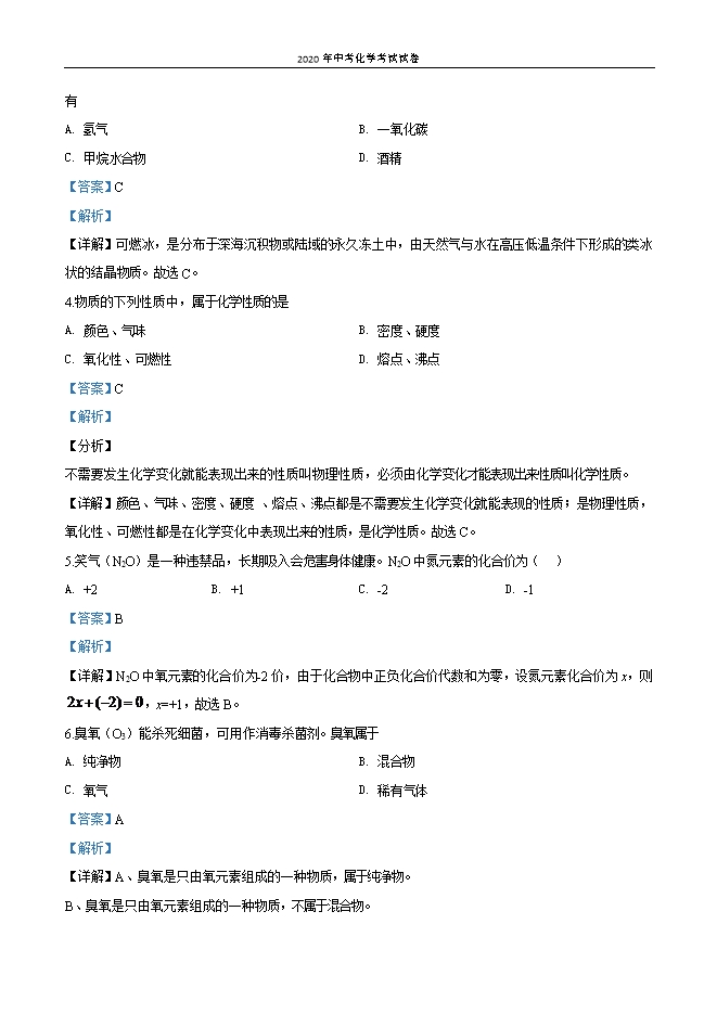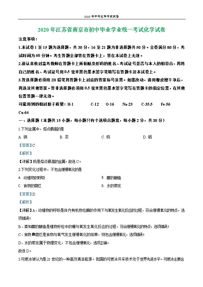 【内容简介】一、选择题(本题共15小题,每小题只有个选项合题意,每小题2分,共30分)1.下列金属中,熔点最高的是A. 铜B. 汞C. 钨D. 铝【答案】C【解析】【详解】钨是熔点最高的金属。故选C。2.下列变化过程中,不包含缓慢氧化的是A. 动植物的呼吸B. 醋的酿造C. 食物的腐烂D. 水的蒸发【答案】D【解析】【详解】A、动植物的呼吸是体内有机物在酶的作用下与氧发生氧化反应的过程,符合缓慢氧化的特点,选项错误;B、酒和醋的酿造是植物籽粒中的糖与氧发生氧化反应的过程,符合缓慢氧化的特点,选项错误;C、食物 腐烂是食物与氧气发生缓慢氧化的结果,则包含缓慢氧化,选项错误;D、水的蒸发属于物理变化,不包含缓慢氧化,选项正确。故选D。3.可燃冰被认为是21世纪的一种高效清洁能源。我国的可燃冰开采技术处于世界先进水平。可燃冰主要含有A. 氢气B. 一氧化碳C. 甲烷水合物D. 酒精【答案】C【解析】【详解】可燃冰,是分布于深海沉积物或陆域的永久冻土中,由天然气与水在高压低温条件下形成的类冰状的结晶物质。故选C。4.物质的下列性质中,属于化学性质的是A. 颜色、气味B. 密度、硬度C. 氧化性、可燃性D. 熔点、沸点【答案】C【解析】【分析】不需要发生化学变化就能表现出来的性质叫物理性质,必须由化学变化才能表现出来性质叫化学性质。【详解】颜色、气味、密度、硬度 、熔点、沸点都是不需要发生化学变化就能表现的性质;是物理性质,氧化性、可燃性都是在化学变化中表现出来的性质,是化学性质。故选C。5.笑气(N2O)是一种违禁品,长期吸入会危害身体健康。N2O中氮元素的化合价为( )A. +2B. +1C. -2D. -1【答案】B【解析】【详解】N2O中氧元素的化合价为-2价,由于化合物中正负化合价代数和为零,设氮元素化合价为x,则 ,x=+1,故选B。6.臭氧(O3)能杀死细菌,可用作消毒杀菌剂。臭氧属于......