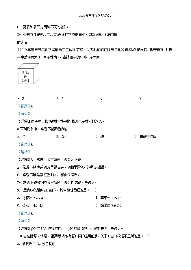 江苏省南京市2020年初中毕业学业统一考试化学试卷(解析版)