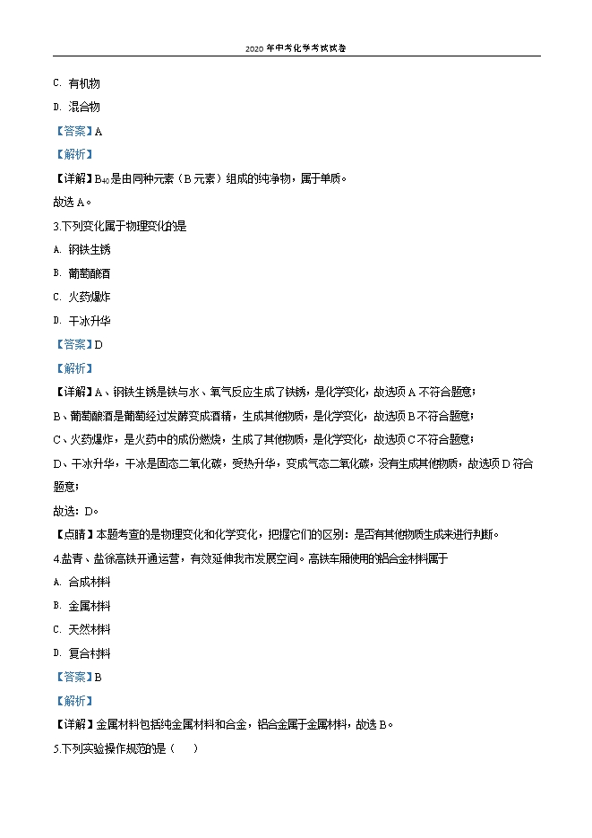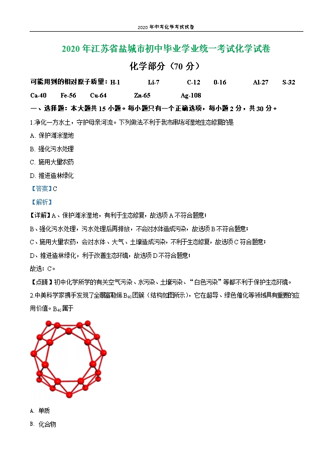 【内容简介】一、选择题:本大题共15小题。每小题只有一个正确选项,每小题2分,共30分。1.净化一方水土,守护母亲河流。下列做法不利于我市串场河湿地生态修复的是A. 保护滩涂湿地B. 强化污水处理C. 施用大量农药D. 推进造林绿化【答案】C【解析】 详解】A、保护滩涂湿地,有利于生态修复,故选项A不符合题意;B、强化污水处理,污水处理后再排放,不会对水体造成污染,故选项B不符合题意;C、施用大量农药,会对水体、大气、土壤造成污染,不利于生态修复,故选项C符合题意;D、推进造林绿化,利于改善生态环境,故选项D不符合题意;故选:C。【点睛】初中化学所学的有关空气污染、水污染、土壤污染、“白色污染”等都不利于保护生态环境。2.中美科学家携手发现了全硼富勒烯B40团簇(结构如图所示),它在超导、绿色催化等领域具有重要的应用价值。B40属于 A. 单质B. 化合物C. 有机物D. 混合物【答案】A【解析】【详解】B40是由同种元素(B元素)组成的纯净物,属于单质。故选A。3.下列变化属于物理变化的是A. 钢铁生锈B. 葡萄酿酒C. 火药爆炸D. 干冰升华【答案】D【解析】【详解】A、钢铁生锈是铁与水、氧气反应生成了铁锈,是化学变化,故选项A不符合题意;B、葡萄酿酒是葡萄经过发酵变成酒精,生成其他物质,是化学变化,故选项B不符合题意;......