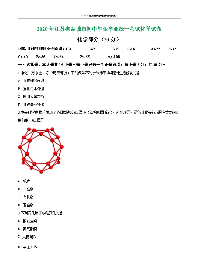 【内容简介】一、选择题:本大题共15小题。每小题只有一个正确选项,每小题2分,共30分。1.净化一方水土,守护母亲河流。下列做法不利于我市串场河湿地生态修复的是A. 保护滩涂湿地B. 强化污水处理C. 施用大量农药D. 推进造林绿化2.中美科学家携手发现了全硼富勒烯B40团簇(结构如图所示),它在超导、绿色催化等领域具有重要的应用价值。B40属于 A. 单质B. 化合物C. 有机物D. 混合物3.下列变化属于物理变化的是A. 钢铁生锈B. 葡萄酿酒C 火药爆炸D. 干冰升华4.盐青、盐徐高铁开通运营,有效延伸我市发展空间。高铁车厢使用的铝合金材料属于A. 合成材料B. 金属材料C. 天然材料D. 复合村料5.下列实验操作规范的是( )......