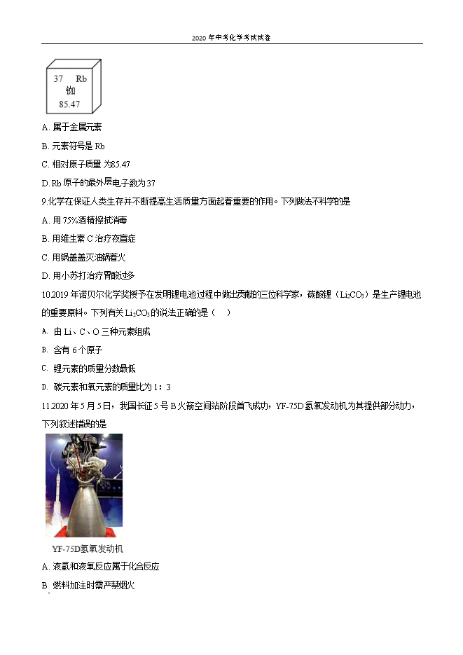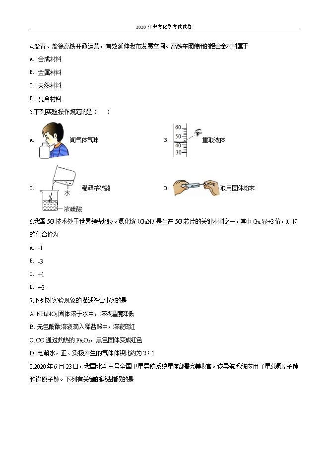 江苏省盐城市2020年初中毕业学业统一考试化学试卷(原卷版)