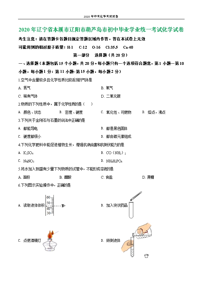 辽宁省本溪市辽阳市葫芦岛市2020年初中毕业学业统一考试化学试卷(原卷版)