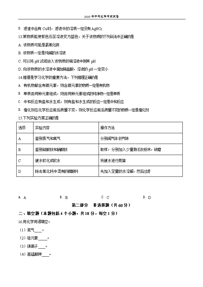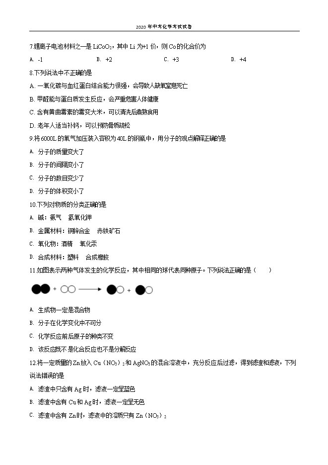 【内容简介】一、选择题(本题包括15个小题,共20分。每小题只有一个选项符合题意,第1小题一第10小题,每小题1分:第11小题~第15小题,每小题2分)1.空气中含量较多且化学性质比较活泼的气体是A. 氮气B. 氧气C. 稀有气体D. 二氧化碳2.物质的下列性质中,属于化学性质的是( )A. 颜色、状态B. 密度、硬度C. 氧化性、可燃物D. 熔点,沸点3.下列关于金刚石与石墨的说法中正确的是A. 都能导电B. 都是黑色固体C. 硬度都很小D. 都由碳元素组成4.下列化学肥料中能促进植物生长,增强抗病虫害和抗倒伏能力的是A. K2SO4B. CO(NH2)2C. NaNO3D. NH4H2PO45.将水加入到盛有少量下列物质的试管中,不能形成溶液的是A. 面粉B. 醋酸C. 食盐D. 蔗糖6.下列图示实验操作中,正确的是A. 读取液体体积 B. 加入块状药品 C. 点燃酒精灯 D. 倾倒液体 7.锂离子电池材料之一是LiCoO2,其中Li为+1价,则Co的化合价为A. -1B. +2C. +3D. +48.下列说法中不正确的是A. 一氧化碳与血红蛋白结合能力很强,会导致人缺氧窒息死亡B. 甲醛能与蛋白质发生反应,会严重危害人体健康C. 含有黄曲霉素的霉变大米,可以清洗后煮熟食用D. 老年人适当补钙,可以预防骨质疏松9.将6000L的氧气加压装入容积为40L的钢瓶中,用分子的观点解释正确的是A. 分子的质量变大了B. 分子的间隔变小了C. 分子的数目变少了D. 分子的体积变小了10.下列对物质的分类正确的是A. 碱:氨气 氢氧化钾B. 金属材料:铜锌合金 赤铁矿石......