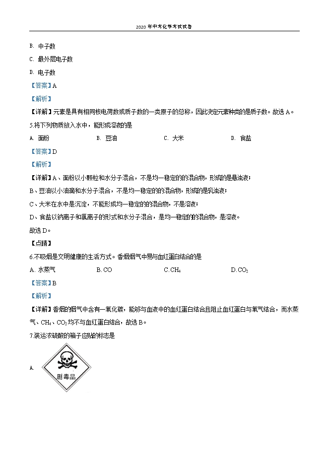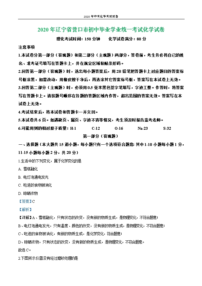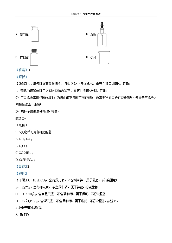 【内容简介】一、选择题(本大题共15道小题,每小题只有一个选项符合题意:其中1-10小题每小题1分,11-15小题每小题2分,共20分)1.生活中的下列变化,属于化学变化的是A. 雪糕融化B. 电灯泡通电发光C. 吃进的食物被消化D. 晾晒衣物【答案】C【解析】【详解】A、雪糕融化,只有状态的改变,没有新的物质生成,是物理变化,不符合题意;B、电灯泡通电发光,只有温度、颜色的改变,没有新的物质生成,是物理变化,不符合题意;C、吃进的食物被消化,有新的物质生成,是化学变化,符合题意;D、晾晒衣物,只有状态的改变,没有新的物质生成,是物理变化,不符合题意。故选C。2.下图所示仪器没有经过磨砂处理的是A. 集气瓶 B. 滴瓶 C. 广口瓶 D. 烧杯 【答案】D【解析】【详解】A、集气瓶需要盖玻璃片, 所以为防止气体逸出,需要在瓶口处磨砂,正确;B、滴瓶的滴管与瓶子之间必须接合紧密,需要进行磨砂处理,正确;C、广口瓶通常用作盛放固体,为防止试剂接触空气而变质,通常要将瓶口进行磨砂处理,使瓶盖与瓶子之间接合紧密,正确;D、烧杯不需要磨砂处理,错误。故选D。【点睛】3.下列物质可用作钾肥的是A. NH4HCO3B. K2CO3C. CO(NH2)2D. Ca(H2PO4)2【答案】B【解析】【详解】A、NH4HCO3,含有氮元素,不含磷和钾,属于氮肥,不符合题意;B、 K2CO3,含有钾元素,不含氮和磷,属于钾肥,符合题意;C、 CO(NH2)2,含有氮元素,不含磷和钾,属于氮肥,不符合题意;......