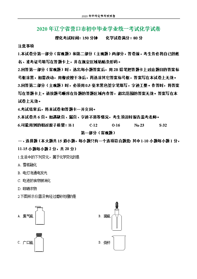 辽宁省营口市2020年初中毕业学业统一考试化学试卷(原卷版)