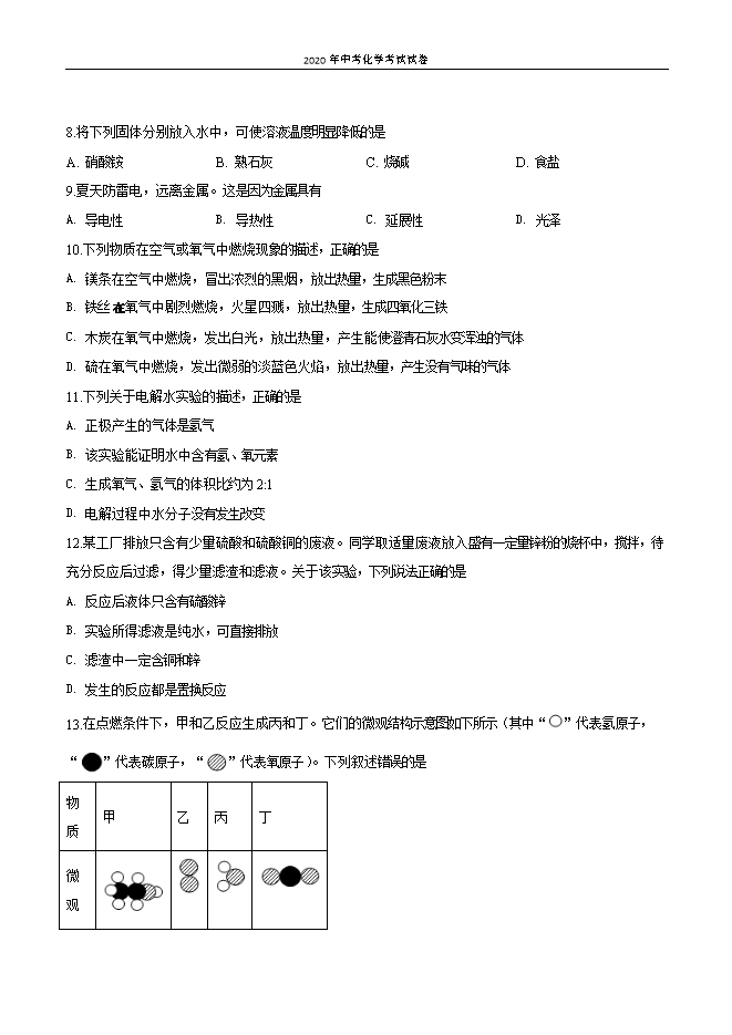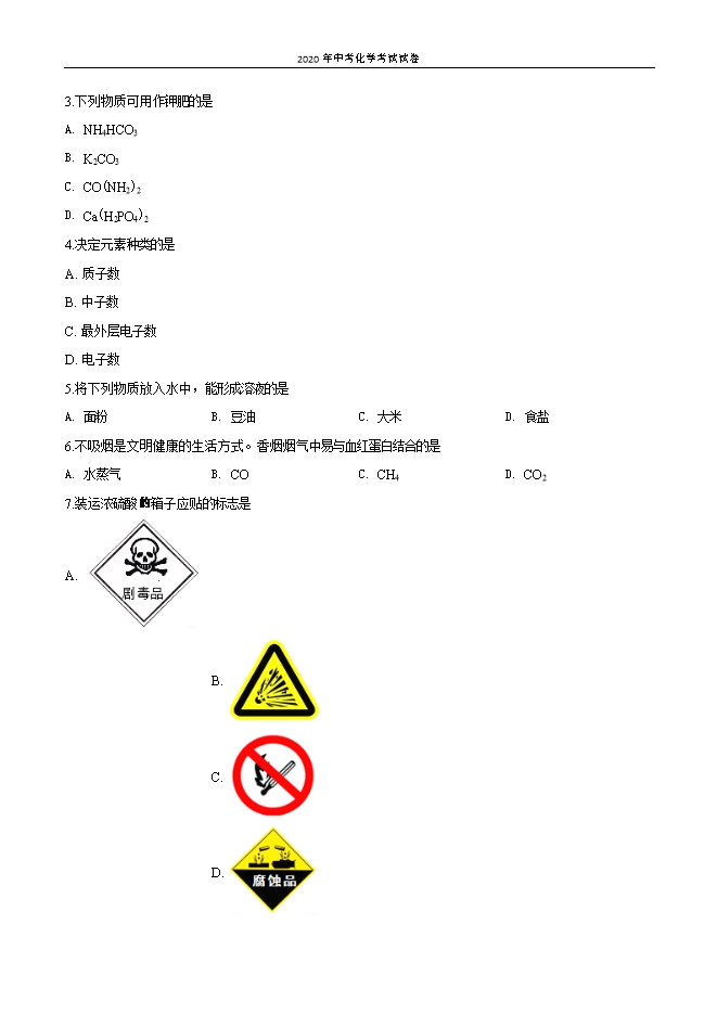 【内容简介】一、选择题(本大题共15道小题,每小题只有一个选项符合题意:其中1-10小题每小题1分,11-15小题每小题2分,共20分)1.生活中的下列变化,属于化学变化的是A. 雪糕融化B. 电灯泡通电发光C. 吃进的食物被消化D. 晾晒衣物2.下图所示仪器没有经过磨砂处理的是A. 集气瓶 B. 滴瓶 C. 广口瓶 D. 烧杯 3.下列物质可用作钾肥的是A. NH4HCO3B. K2CO3C. CO(NH2)2D. Ca(H2PO4)24.决定元素种类的是A. 质子数B. 中子数C. 最外层电子数D. 电子数5.将下列物质放入水中,能形成溶液的是A. 面粉B. 豆油C. 大米D. 食盐6.不吸烟是文明健康的生活方式。香烟烟气中易与血红蛋白结合的是A. 水蒸气B. COC. CH4D. CO27.装运浓硫酸 箱子应贴的标志是8.将下列固体分别放入水中,可使溶液温度明显降低的是A. 硝酸铵B. 熟石灰C. 烧碱D. 食盐9.夏天防雷电,远离金属。这是因为金属具有A. 导电性B. 导热性C. 延展性D. 光泽10.下列物质在空气或氧气中燃烧现象的描述,正确的是A. 镁条在空气中燃烧,冒出浓烈的黑烟,放出热量,生成黑色粉末B. 铁丝 氧气中剧烈燃烧,火星四溅,放出热量,生成四氧化三铁C. 木炭在氧气中燃烧,发出白光,放出热量,产生能使澄清石灰水变浑浊的气体D. 硫在氧气中燃烧,发出微弱的淡蓝色火焰,放出热量,产生没有气味的气体11.下列关于电解水实验的描述,正确的是A. 正极产生的气体是氢气B. 该实验能证明水中含有氢、氧元素C. 生成氧气、氢气的体积比约为2:1D. 电解过程中水分子没有发生改变......