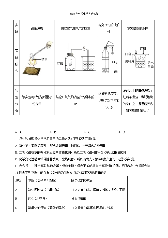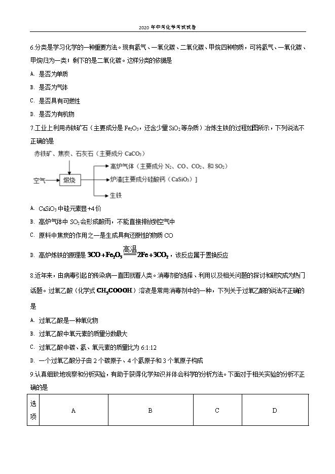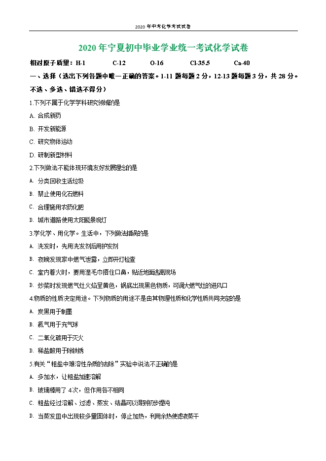 宁夏2020年初中毕业学业统一考试化学试卷(原卷版)