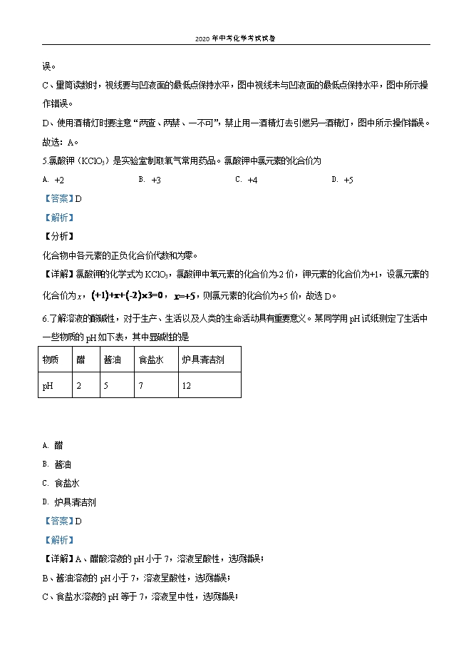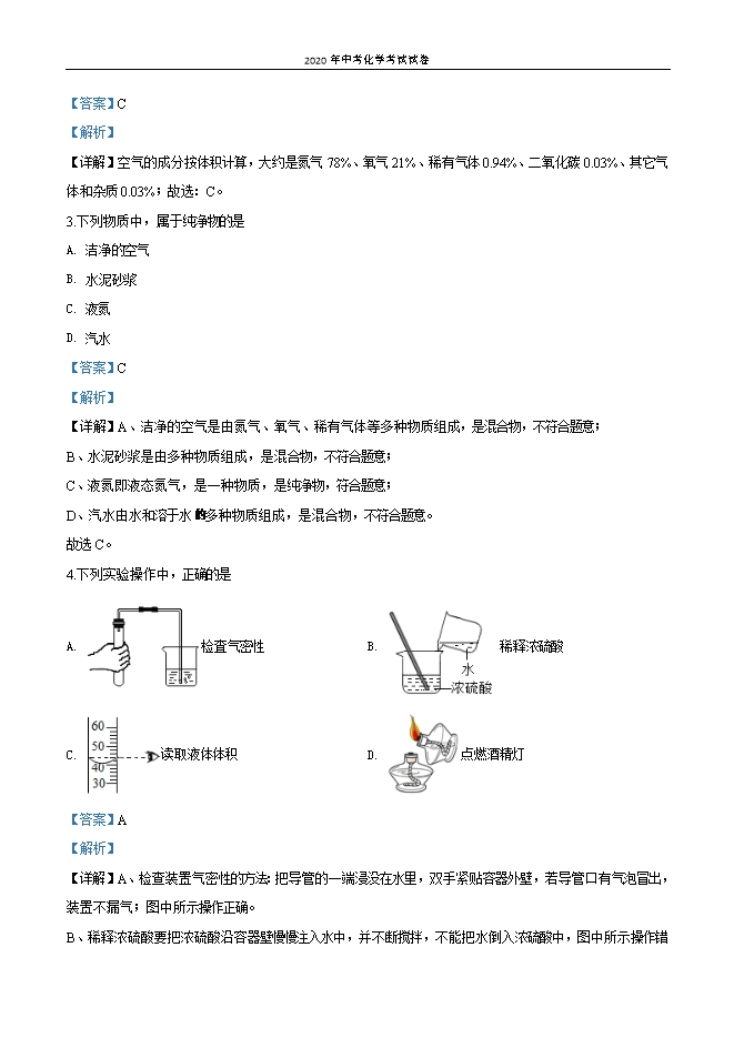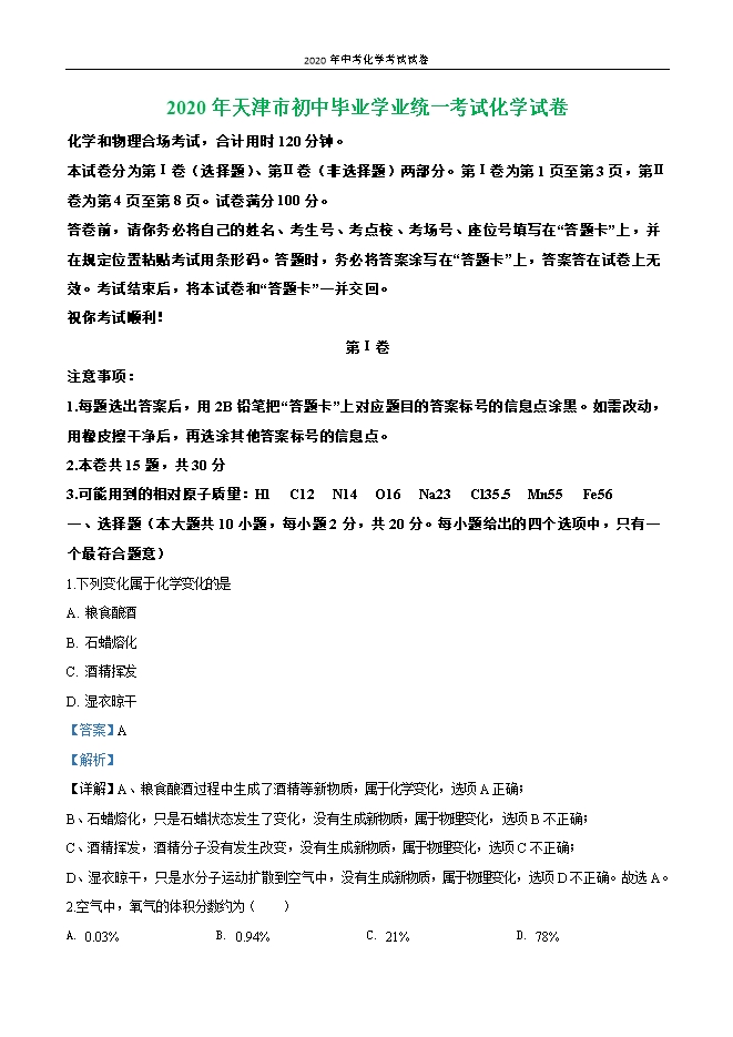 【内容简介】一、选择题(本大题共10小题,每小题2分,共20分。每小题给出的四个选项中,只有一个最符合题意)1.下列变化属于化学变化的是A. 粮食酿酒B. 石蜡熔化C. 酒精挥发D. 湿衣晾干【答案】A【解析】【详解】A、粮食酿酒过程中生成了酒精等新物质,属于化学变化,选项A正确;B、石蜡熔化,只是石蜡状态发生了变化,没有生成新物质,属于物理变化,选项B不正确;C、酒精挥发,酒精分子没有发生改变,没有生成新物质,属于物理变化,选项C不正确;D、湿衣晾干,只是水分子运动扩散到空气中,没有生成新物质,属于物理变化,选项D不正确。故选A。2.空气中,氧气的体积分数约为( )A. 0.03%B. 0.94%C. 21%D. 78%【答案】C【解析】【详解】空气的成分按体积计算,大约是氮气78%、氧气21%、稀有气体0.94%、二氧化碳0.03%、其它气体和杂质0.03%;故选:C。3.下列物质中,属于纯净物的是A. 洁净的空气B. 水泥砂浆C. 液氮D. 汽水【答案】C【解析】【详解】A、洁净的空气是由氮气、氧气、稀有气体等多种物质组成,是混合物,不符合题意; B、水泥砂浆是由多种物质组成,是混合物,不符合题意; C、液氮即液态氮气,是一种物质,是纯净物,符合题意; D、汽水由水和溶于水 多种物质组成,是混合物,不符合题意。故选C。4.下列实验操作中,正确的是......