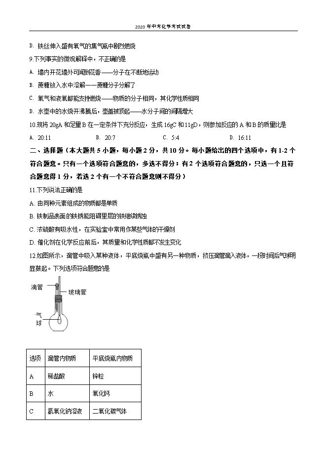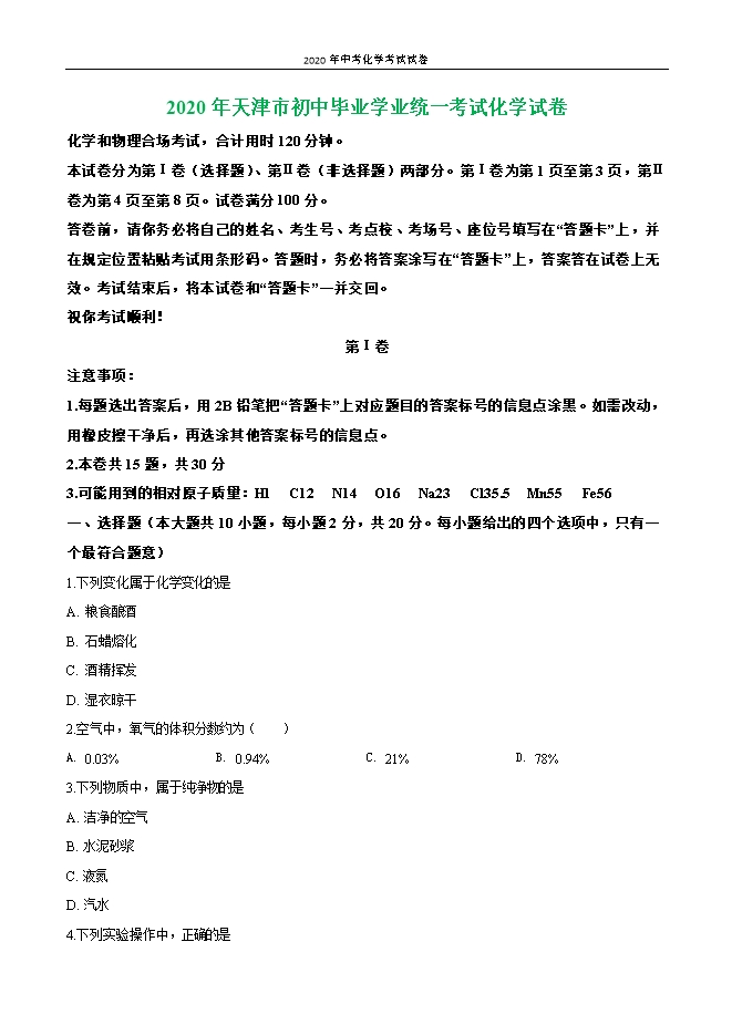 天津市2020年初中毕业学业统一考试化学试卷(原卷版)