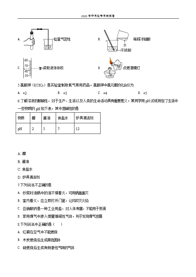 【内容简介】1.每题选出答案后,用2B铅笔把“答题卡”上对应题目的答案标号的信息点涂黑。如需改动,用橡皮擦干净后,再选涂其他答案标号的信息点。2.本卷共15题,共30分3.可能用到的相对原子质量:Hl C12 N14 O16 Na23 Cl35.5 Mn55 Fe56一、选择题(本大题共10小题,每小题2分,共20分。每小题给出的四个选项中,只有一个最符合题意)1.下列变化属于化学变化的是A. 粮食酿酒B. 石蜡熔化C. 酒精挥发D. 湿衣晾干2.空气中,氧气的体积分数约为( )A. 0.03%B. 0.94%C. 21%D. 78%3.下列物质中,属于纯净物的是A. 洁净的空气B. 水泥砂浆C. 液氮D. 汽水4.下列实验操作中,正确的是A. 检査气密性B. 稀释浓硫酸C. 读取液体体积D. 点燃酒精灯5.氯酸钾(KClO3)是实验室制取氧气常用药品。氯酸钾中氯元素的化合价为A. +2B. +3C. +4D. +56.了解溶液的酸碱性,对于生产、生活以及人类的生命活动具有重要意义。某同学用pH试纸测定了生活中一些物质的pH如下表,其中显碱性的是.......