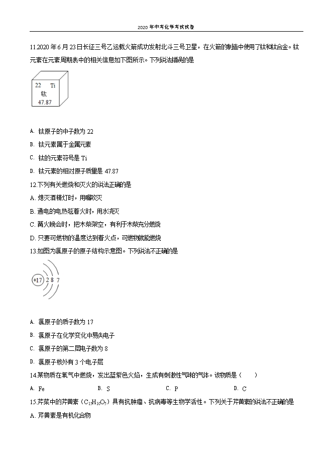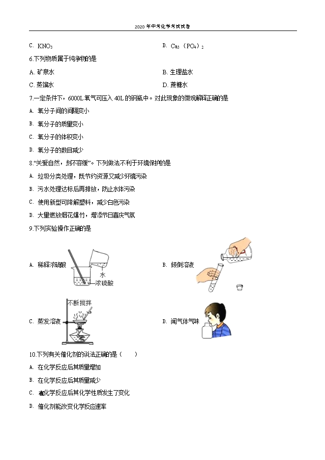 【内容简介】一、选择题(本大题共20个小题,第1-15小题,每小题2分,第16-20小题,每小题3分,共45分。每小题只有一个选项符合题意,多选、错选或不选均不得分。请将符合题意的选项的序号在答题卡相应位置上涂黑)1.下列中国古代发明及应用中,只涉及物理变化的是A. 火药爆炸B. 手工剪纸C. 粮食酿酒D. 烧制陶瓷2. 小红不爱吃水果蔬菜,从营养均衡的角度评价,小红最有可能缺乏A. 蛋白质B. 糖类C. 油脂D. 维生素3. 空气的成分中能供给人体呼吸的气体是( )A. 氮气B. 氧气C. 稀有气体D. 二氧化碳4.下表是日常生活中常见物质的pH,其中碱性最强的是物质酱油牛奶鸡蛋清炉具清洁剂pH4~56~77~812~13A. 酱油B. 牛奶C. 鸡蛋清D. 炉具清洁剂5.磷肥可以促进作物生长,增强作物的抗寒、抗旱能力。下列化肥属于磷肥的是A. K2SO4B. NH4ClC. KNO3D. Ca3 (PO4)26.下列物质属于纯净物的是A. 矿泉水B. 生理盐水C. 蒸馏水D. 蔗糖水7.一定条件下,6000L氧气可压入40L的钢瓶中。对此现象的微观解释正确的是A. 氧分子间的间隔变小B. 氧分子的质量变小C. 氧分子的体积变小D. 氧分子的数目减少8.“关爱自然,刻不容缓”。下列做法不利于环境保护的是A. 垃圾分类处理,既节约资源又减少环境污染B. 污水处理达标后再排放,防止水体污染C. 使用新型可降解塑料,减少白色污染D. 大量燃放烟花爆竹,增添节日喜庆气氛9.下列实验操作正确的是........