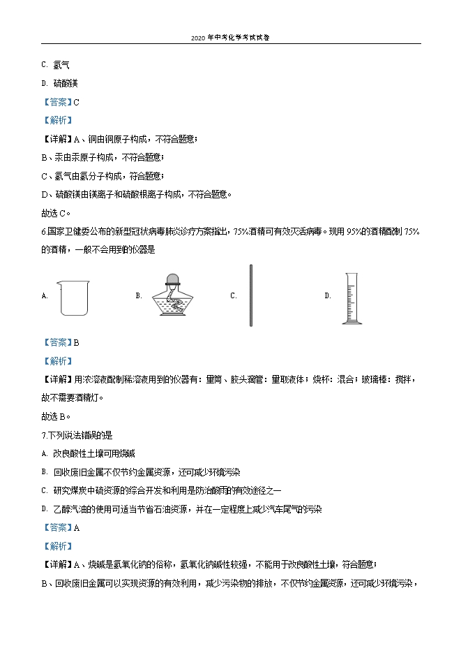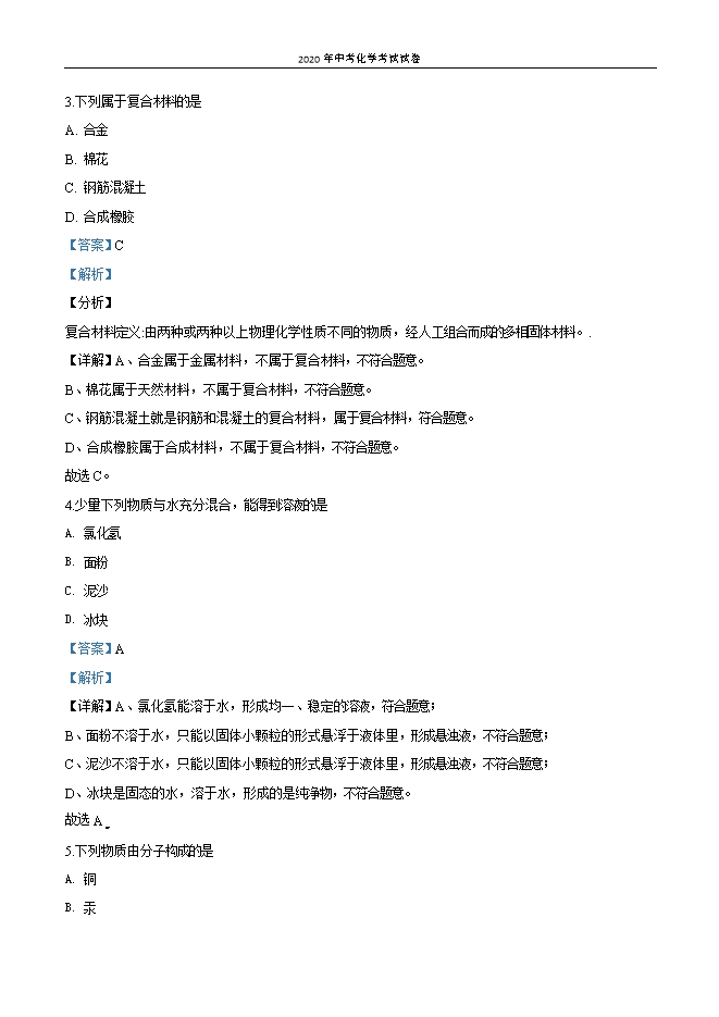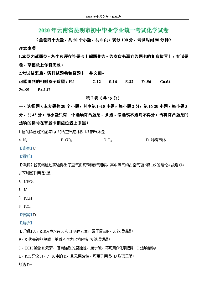 【内容简介】一、选择题(本大题共20个小题,其中第1~15小题,每小题2分,第16-20小题,每小题3分,共45分。每小题只有一个选项符合题意,多选、错选或不选均不得分。请将符合题意的选项的标号在答题卡相应位置上涂黑)1.拉瓦锡通过实验得出:约占空气总体积1/5的气体是A. N2B. CO2C. O2D. 稀有气体【答案】C【解析】【详解】拉瓦锡通过实验得出了空气由氧气和氮气组成,其中氧气约占空气总体积1/5的结论。故选C。2.下列属于钾肥的是A. KNO3B. KC. KOHD. KCl【答案】D【解析】【详解】A、KNO3中含有K和N两种元素,属于复合肥,A选项错误;B、K代表钾的单质,单质不作为化学肥料,B选项错误;C、KOH虽含K元素,但有强烈的腐蚀性,属于碱,不可用作化学肥料,C选项错误;D、KCl只含N、P、K中的K,且无腐蚀性,可用于钾肥,D选项正确;故选D。......