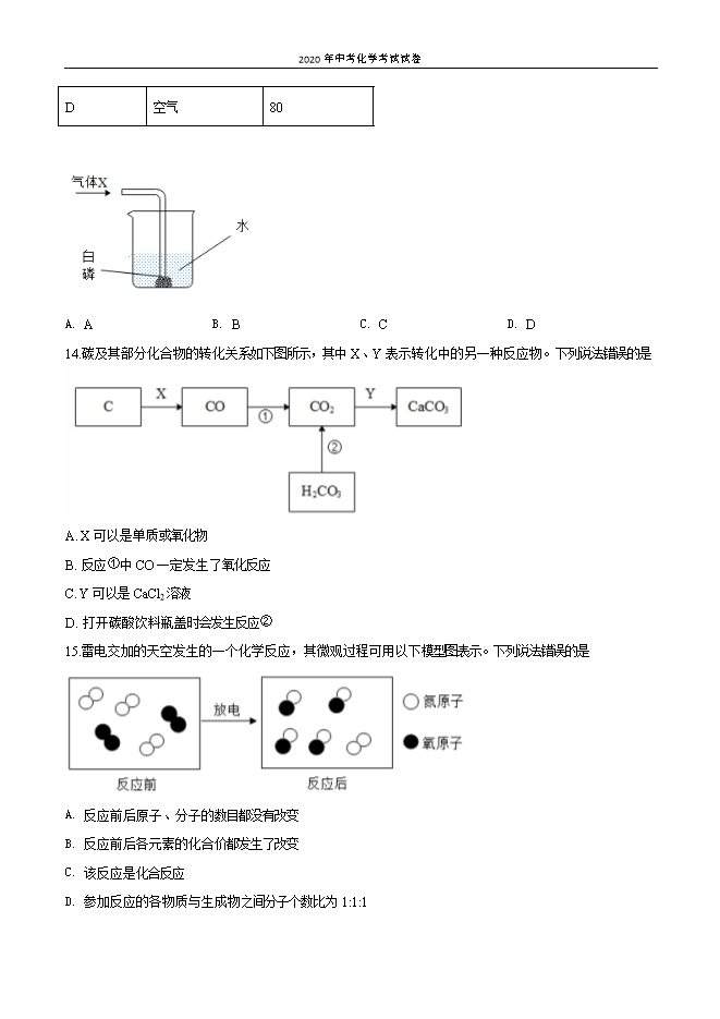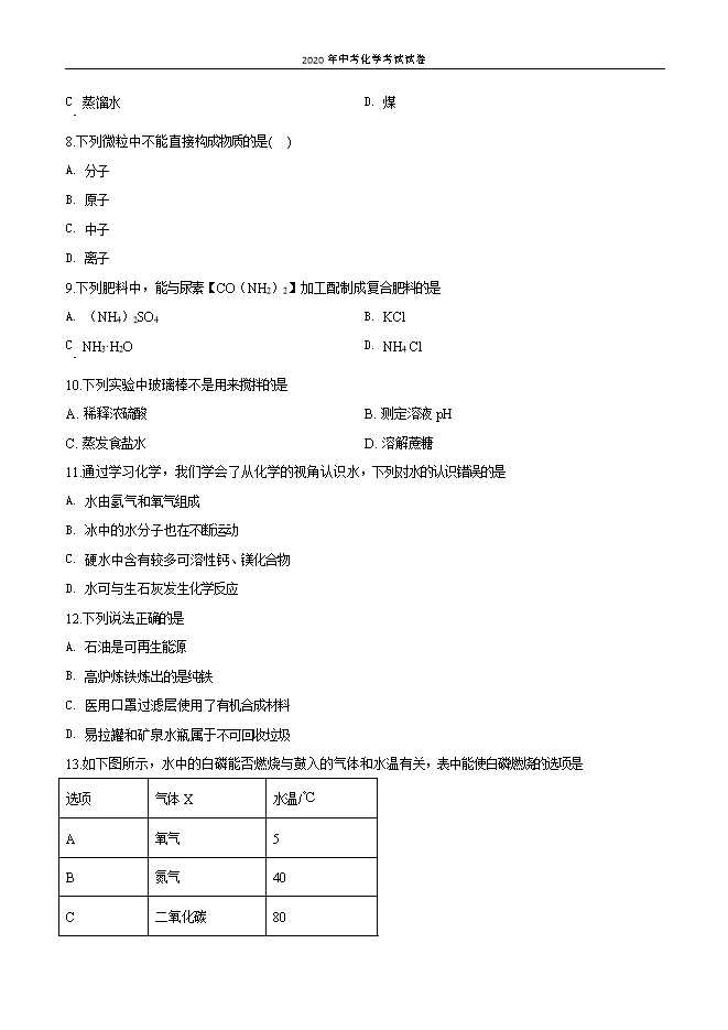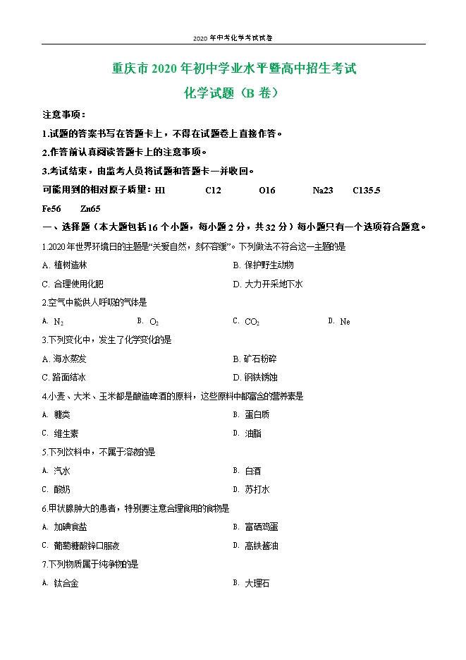 【内容简介】一、选择题(本大题包括16个小题,每小题2分,共32分)每小题只有一个选项符合题意。1.2020年世界环境日的主题是“关爱自然,刻不容缓”。下列做法不符合这一主题的是A. 植树造林B. 保护野生动物C. 合理使用化肥D. 大力开采地下水2.空气中能供人呼吸的气体是A. N2B. O2C. CO2D. Ne3.下列变化中,发生了化学变化的是A. 海水蒸发B. 矿石粉碎C. 路面结冰D. 钢铁锈蚀4.小麦、大米、玉米都是酿造啤酒的原料,这些原料中都富含的营养素是A. 糖类B. 蛋白质C. 维生素D. 油脂5.下列饮料中,不属于溶液的是A. 汽水B. 白酒C. 酸奶D. 苏打水6.甲状腺肿大的患者,特别要注意合理食用的食物是A. 加碘食盐B. 富硒鸡蛋C. 葡萄糖酸锌口服液D. 高铁酱油7.下列物质属于纯净物的是A. 钛合金B. 大理石C 蒸馏水D. 煤8.下列微粒中不能直接构成物质的是( )A. 分子B. 原子C. 中子D. 离子........