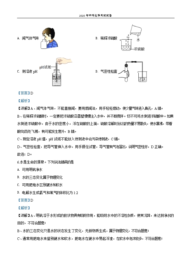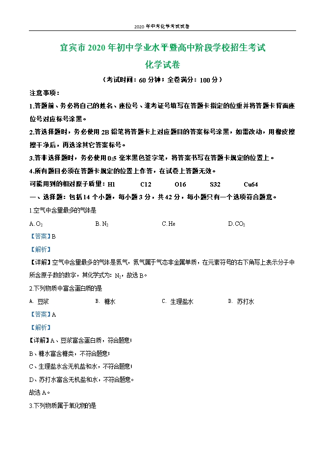 四川省宜宾市2020年初中毕业学业统一考试化学试卷(解析版)