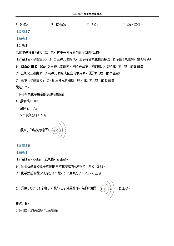 【内容简介】一、选择题:包括14个小题,每小题3分,共42分,每小题只有一个选项符合题意。1.空气中含量最多的气体是A. O2B. N2C. HeD. CO2【答案】B【解析】【详解】空气中含量最多 气体是氮气,氮气属于气态非金属单质,在元素符号的右下角写上表示分子中所含原子数的数字,其化学式为:N2,故选B。2.下列物质中富含蛋白质的是A. 豆浆B. 糖水C. 生理盐水D. 苏打水【答案】A【解析】 详解】A、豆浆富含蛋白质,符合题意;B、糖水富含糖类,不符合题意;C、生理盐水含无机盐和水,不符合题意;D、苏打水富含无机盐和水,不符合题意。故选A。3.下列物质属于氧化物的是A. HNO3B. KMnO4C. P2O5D. Cu(OH)2【答案】C【解析】【分析】氧化物是指由两种元素组成,其中一种元素为氧元素的化合物。【详解】A、硝酸由H、N、O三种元素组成,则不符合氧化物的概念,即不属于氧化物,故A错误; B、KMnO4由K、Mn、O三种元素组成,则不符合氧化物的概念,即不属于氧化物,故B错误;C、五氧化二磷由P、O两种元素组成且含有氧元素,属于氧化物,故C正确; D、氢氧化铜是由Cu、O、H三种元素组成,则不属于氧化物,故D错误;故选:C。4.下列有关化学用语的表述错误的是A. 氢氧根:OH-B. 金刚石:C60C. 5个臭氧分子:5O3......