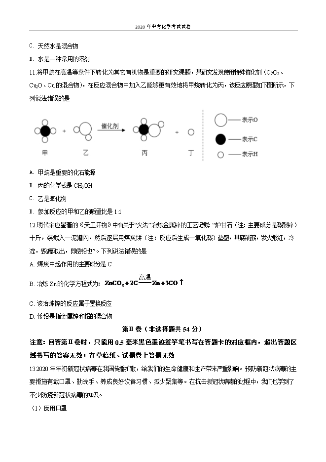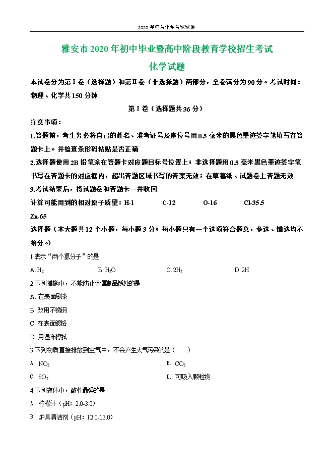 四川省雅安市2020年初中毕业学业统一考试化学试卷(原卷版)