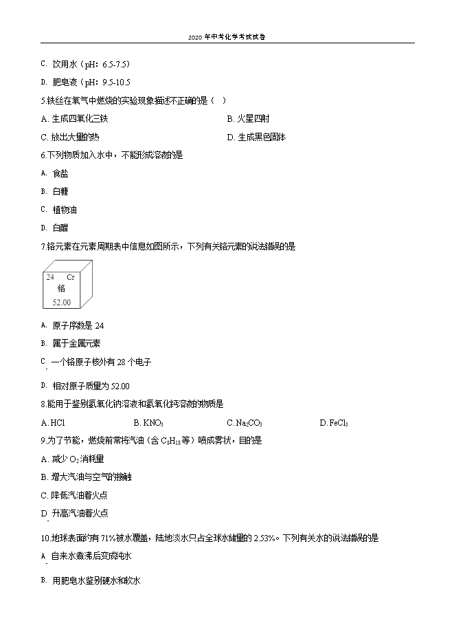 【内容简介】选择题(本大题共12个小题,每小题3分;每小题只有一个选项符合题意,多选、错选均不给分。)1.表示“两个氢分子”的是A. H2B. H2OC. 2H2D. 2H2.下列措施中,不能防止金属制品锈蚀的是A. 在表面刷漆B. 改用不锈钢C. 在表面镀铬D. 用湿布擦拭3.下列物质直接排放到空气中,不会产生大气污染的是( )A. NO2B. CO2C. SO2D. 可吸入颗粒物4.下列液体中,酸性最强的是A. 柠檬汁(pH:2.0-3.0)B. 炉具清洁剂(pH:12.0-13.0)C. 饮用水(pH:6.5-7.5)D. 肥皂液(pH:9.5-10.55.铁丝在氧气中燃烧的实验现象描述不正确的是( )A. 生成四氧化三铁B. 火星四射C. 放出大量的热D. 生成黑色固体6.下列物质加入水中,不能形成溶液的是A. 食盐B. 白糖C. 植物油D. 白醋7.铬元素在元素周期表中信息如图所示,下列有关铬元素的说法错误的是 A. 原子序数是24B. 属于金属元素C 一个铬原子核外有28个电子D. 相对原子质量为52.008.能用于鉴别氢氧化钠溶液和氢氧化钙溶液的物质是A. HClB. KNO3C. Na2CO3D. FeCl39.为了节能,燃烧前常将汽油(含C8H18等)喷成雾状,目的是A. 减少O2消耗量B. 增大汽油与空气的接触C. 降低汽油着火点D 升高汽油着火点10.地球表面约有71%被水覆盖,陆地淡水只占全球水储量的2.53%。下列有关水的说法错误的是A 自来水煮沸后变成纯水B. 用肥皂水鉴别硬水和软水......