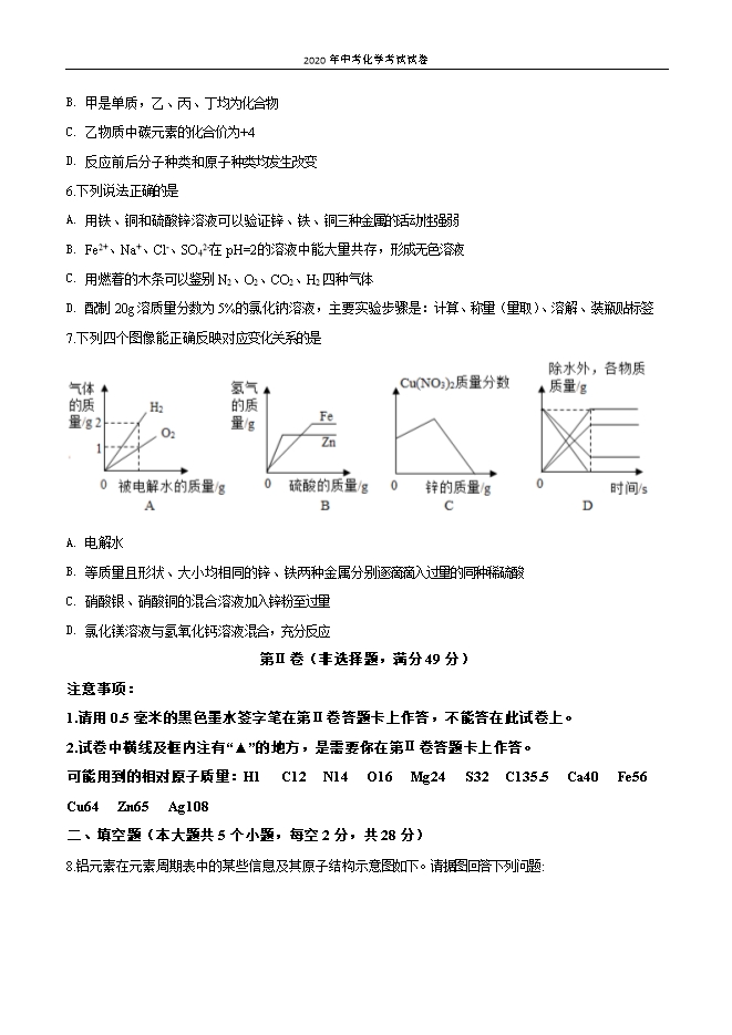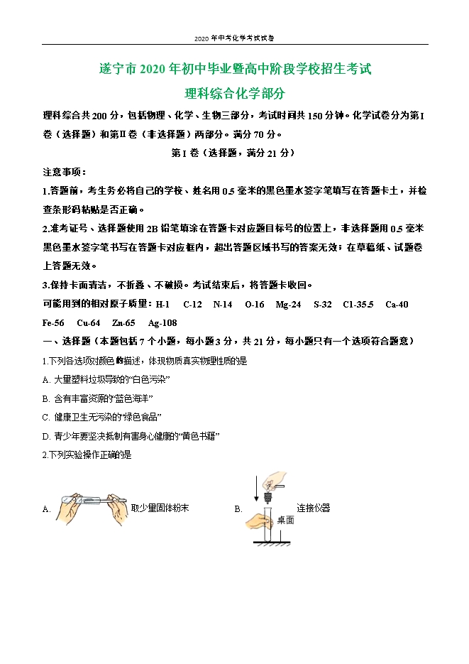 四川省遂宁市2020年初中毕业学业统一考试化学试卷(原卷版)