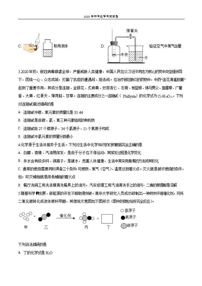 【内容简介】一、选择题(本题包括7个小题,每小题3分,共21分,每小题只有一个选项符合题意)1.下列各选项对颜色 描述,体现物质真实物理性质的是A. 大量塑料垃圾导致的“白色污染”B. 含有丰富资源的“蓝色海洋”C. 健康卫生无污染 “绿色食品”D. 青少年要坚决抵制有害身心健康的“黄色书籍”2.下列实验操作正确的是A. 取少量固体粉末B. 连接仪器C. 取用液体D. 验证空气中氧气含量3.2020年初,新冠病毒肆虐全球,严重威胁人类健康,中国人民在以习近平同志为核心的党中央坚强领导下,团结一心、众志成城,打贏了抗疫的遭遇战、阻击战。在治疗新冠肺炎的药物中,中药“连花清瘟胶囊”起到了重要作用,其成分是连翘、金银花、炙麻黄、炒苦杏仁、石膏、板蓝根、绵马贯众、鱼腥草、广藿香、大黄、红景天、薄荷脑、甘草。连翘的主要成分之一连翘甙( Phillyrin)的化学式为C27H34O11,下列对连翘甙描述错误的是A. 连翘甙中碳、氧元素的质量比是81:44B. 连翘甙是由碳、氢、氧三种元素组成的有机物C. 连翘甙由27个碳原子、34个氢原子、11个氧原子构成D. 连翘甙中氢元素的质量分数最小4.化学源于生活并服务于生活。下列对生活中化学知识的归纳概括完全正确的是A. 白醋、酒精、汽油易挥发,是由于分子在不停运动,其挥发过程是化学变化B. 井水含有较多钙、镁离子,是硬水,危害人体健康,生活中常采用煮沸的方法将其软化C. 通常的燃烧需要同时具备三个条件:可燃物、氧气(空气)、温度达到着火点。灭火就是破坏燃烧的条件,如:吹灭蜡烛就是降低蜡烛的着火点D. 餐厅洗碗工用洗洁精清洗餐具上的油污,汽车修理工用汽油清洗手上的油污,二者的原理都是溶解5.随着科学 发展,新能源的开发不断取得突破。清华大学研究人员成功研制出一种纳米纤维催化剂,可将二氧化碳转化成液体燃料甲醇,其微观示意图如下图所示(图中的微粒恰好完全反应)。 下列说法错误的是A. 丁的化学式是H2O......