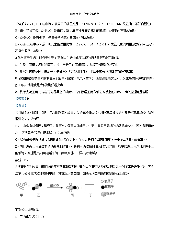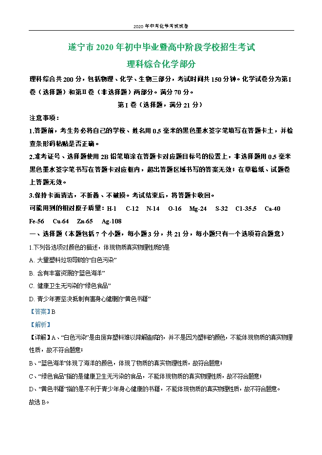 四川省遂宁市2020年初中毕业学业统一考试化学试卷(解析版)