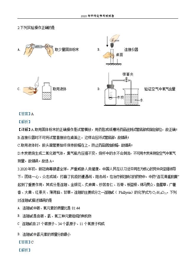【内容简介】一、选择题(本题包括7个小题,每小题3分,共21分,每小题只有一个选项符合题意)1.下列各选项对颜色的描述,体现物质真实物理性质的是A. 大量塑料垃圾导致的“白色污染”B. 含有丰富资源的“蓝色海洋”C. 健康卫生无污染的“绿色食品”D. 青少年要坚决抵制有害身心健康的“黄色书籍”【答案】B【解析】【详解】A、“白色污染”是由废弃塑料难以降解造成的,并不是因为塑料的颜色,不能体现物质的真实物理性质,故不符合题意;B、“蓝色海洋”体现了海洋的颜色,体现了物质的真实物理性质,故符合题意;C、“绿色食品”指的是健康卫生无污染的食品,不能体现物质的真实物理性质,故不符合题意;D、“黄色书籍”指的是不利于青少年身心健康的书籍,不能体现物质的真实物理性质,故不符合题意。故选B。2.下列实验操作正确的是A. 取少量固体粉末B. 连接仪器C. 取用液体D. 验证空气中氧气含量【答案】A【解析】【详解】A.取用固体粉末的正确操作是试管横放,用药匙或纸槽将药品送到试管底部或指定部位,故正确;B.连接仪器时不可将试管直接放在桌面上,这样会压坏试管底部,故错误;C.取用液体时,胶头滴管要始终保持胶帽在上,防止药品腐蚀胶帽,故错误;D.木炭燃烧生成二氧化碳气体,集气瓶内压强不变,烧杯中的水不会倒流,不可用木炭来测定空气中氧气测量,故错误。故选A。3.2020年初,新冠病毒肆虐全球,严重威胁人类健康,中国人民在以习近平同志为核心的党中央坚强领导下,团结一心、众志成城,打贏了抗疫的遭遇战、阻击战。在治疗新冠肺炎的药物中,中药“连花清瘟胶囊”起到了重要作用,其成分是连翘、金银花、炙麻黄、炒苦杏仁、石膏、板蓝根、绵马贯众、鱼腥草、广藿香、大黄、红景天、薄荷脑、甘草。连翘的主要成分之一连翘甙( Phillyrin)的化学式为C27H34O11,下列对连翘甙描述错误的是.......