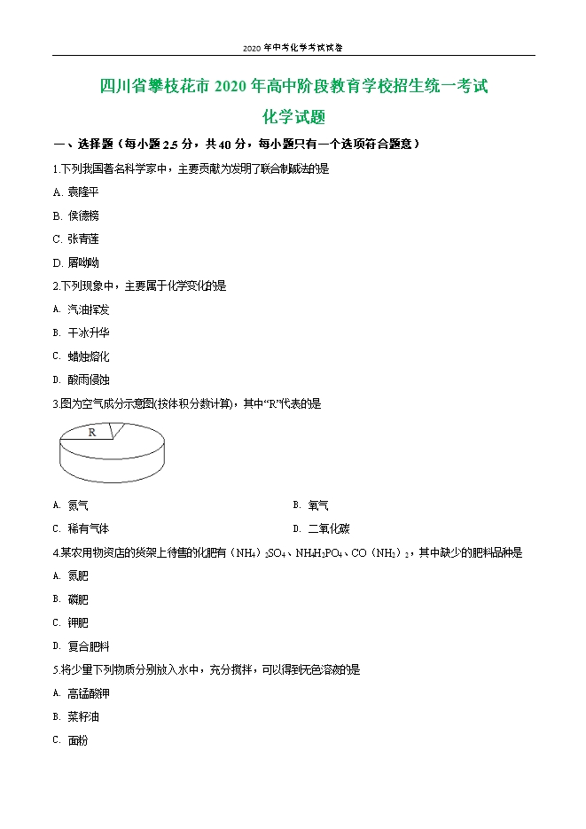 【内容简介】一、选择题(每小题2.5分,共40分,每小题只有一个选项符合题意)1.下列我国著名科学家中,主要贡献为发明了联合制碱法的是A. 袁隆平B. 侯德榜C. 张青莲D. 屠呦呦2.下列现象中,主要属于化学变化的是A. 汽油挥发B. 干冰升华C. 蜡烛熔化D. 酸雨侵蚀3.图为空气成分示意图(按体积分数计算),其中“R”代表的是 A. 氮气B. 氧气C. 稀有气体D. 二氧化碳4.某农用物资店的货架上待售的化肥有(NH4)2SO4、NH4H2PO4、CO(NH2)2,其中缺少的肥料品种是A. 氮肥B. 磷肥C. 钾肥D. 复合肥料5.将少量下列物质分别放入水中,充分搅拌,可以得到无色溶液的是A. 高锰酸钾B. 菜籽油C. 面粉......