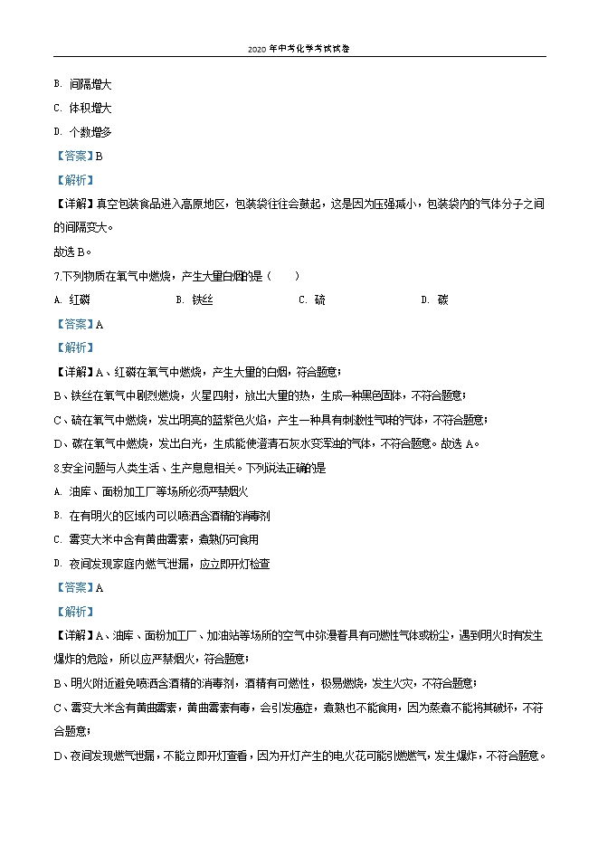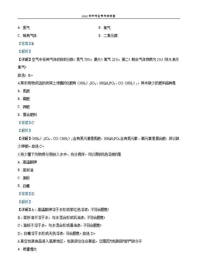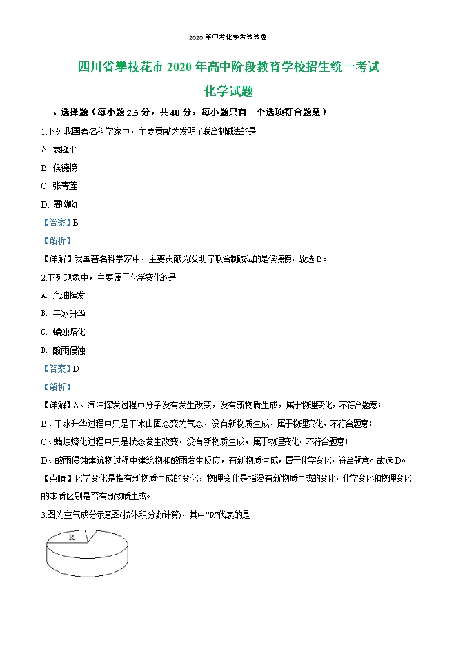 【内容简介】一、选择题(每小题2.5分,共40分,每小题只有一个选项符合题意)1.下列我国著名科学家中,主要贡献为发明了联合制碱法的是A. 袁隆平B. 侯德榜C. 张青莲D. 屠呦呦【答案】B【解析】【详解】我国著名科学家中,主要贡献为发明了联合制碱法的是侯德榜,故选B。2.下列现象中,主要属于化学变化的是A. 汽油挥发B. 干冰升华C. 蜡烛熔化D. 酸雨侵蚀【答案】D【解析】【详解】A、汽油挥发过程中分子没有发生改变,没有新物质生成,属于物理变化,不符合题意;B、干冰升华过程中只是干冰由固态变为气态,没有新物质生成,属于物理变化,不符合题意;C、蜡烛熔化过程中只是状态发生改变,没有新物质生成,属于物理变化,不符合题意;D、酸雨侵蚀建筑物过程中建筑物和酸雨发生反应,有新物质生成,属于化学变化,符合题意。故选D。【点睛】化学变化是指有新物质生成的变化,物理变化是指没有新物质生成的变化,化学变化和物理变化的本质区别是否有新物质生成。3.图为空气成分示意图(按体积分数计算),其中“R”代表的是 A. 氮气B. 氧气C. 稀有气体D. 二氧化碳【答案】B【解析】【详解】空气中各种气体的体积分数:氮气78%,最大;氧气21%,第二;剩余气体物质为1%;则R表示氧气;故选:B。4.某农用物资店的货架上待售的化肥有(NH4)2SO4、NH4H2PO4、CO(NH2)2,其中缺少的肥料品种是A. 氮肥B. 磷肥C. 钾肥D. 复合肥料【答案】C【解析】【详解】(NH4)2SO4、CO(NH2)2含有氮元素是氮肥,NH4H2PO4含有氮元素、磷元素是复合肥,所以缺少钾肥。故选C。......