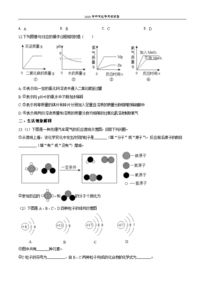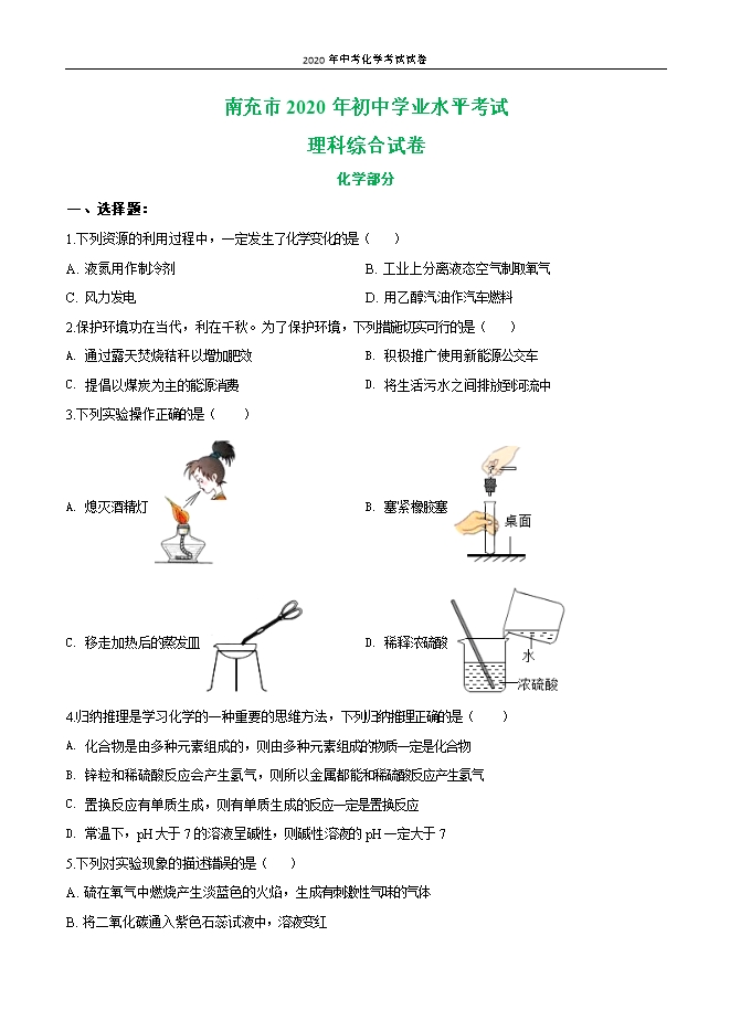 四川省南充市2020年初中毕业学业统一考试化学试卷(原卷版)
