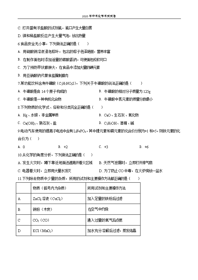 【内容简介】一、选择题:1.下列资源的利用过程中,一定发生了化学变化的是( )A. 液氮用作制冷剂B. 工业上分离液态空气制取氧气C. 风力发电D. 用乙醇汽油作汽车燃料2.保护环境功在当代,利在千秋。为了保护环境,下列措施切实可行的是( )A. 通过露天焚烧秸秆以增加肥效B. 积极推广使用新能源公交车C. 提倡以煤炭为主的能源消费D. 将生活污水之间排放到河流中3.下列实验操作正确的是( )A. 熄灭酒精灯 B. 塞紧橡胶塞 C. 移走加热后的蒸发皿 D. 稀释浓硫酸 4.归纳推理是学习化学的一种重要的思维方法,下列归纳推理正确的是( )A. 化合物是由多种元素组成的,则由多种元素组成的物质一定是化合物B. 锌粒和稀硫酸反应会产生氢气,则所以金属都能和稀硫酸反应产生氢气C. 置换反应有单质生成,则有单质生成的反应一定是置换反应D. 常温下,pH大于7的溶液呈碱性,则碱性溶液的pH一定大于75.下列对实验现象的描述错误的是( )A. 硫在氧气中燃烧产生淡蓝色的火焰,生成有刺激性气味的气体B. 将二氧化碳通入紫色石蕊试液中,溶液变红C. 打开盛有浓盐酸的试剂瓶,瓶口产生大量白雾D. 镁和稀盐酸反应产生大量气泡,放出热量6.食品安全无小事,下列做法正确的是( )A. 用硫酸铜溶液浸泡粽叶,包出的粽子色泽艳丽,营养丰富B. 在制作面包时添加适量的碳酸氢钠,可使面包松软可口C. 为了预防甲状腺肿大,在食品中添加大量的碘元素D. 用亚硝酸钠代替食盐腌制腊肉7.某功能饮料含有牛磺酸(C2H7NO3S),下列关于牛磺酸的说法正确的是( )A. 牛磺酸是由14个原子构成的B. 牛磺酸的相对分子质量为125gC. 牛磺酸是一种有机化合物D. 牛磺酸中氮元素的质量分数最小8.下列物质的化学式、俗称和分类完全正确的是( )......