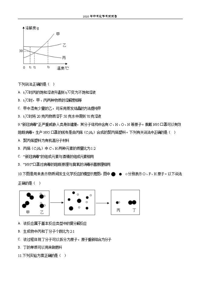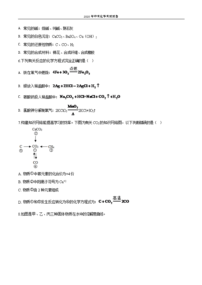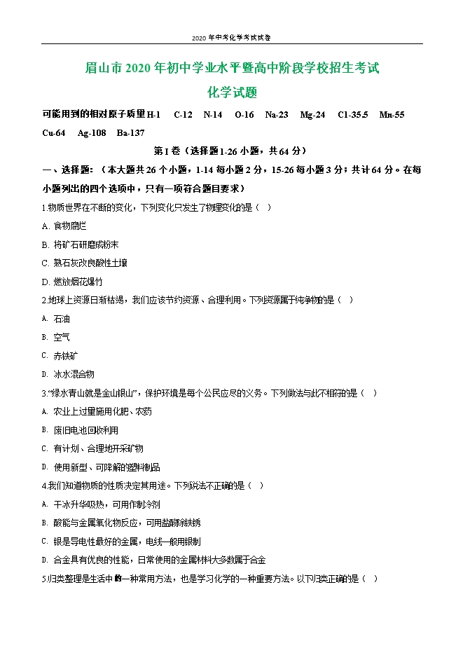 四川省眉山市2020年初中毕业学业统一考试化学试卷(原卷版)