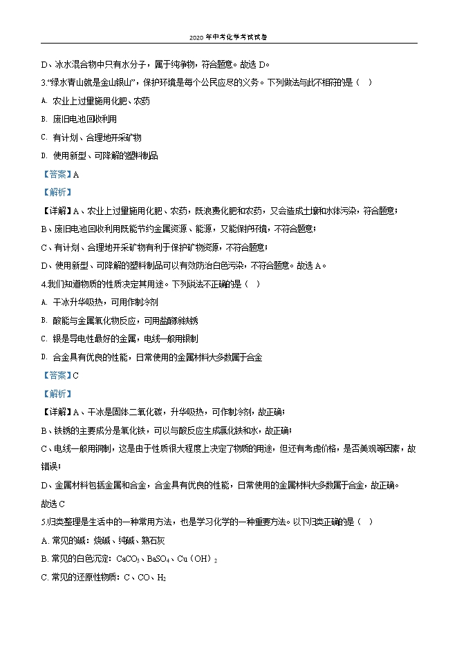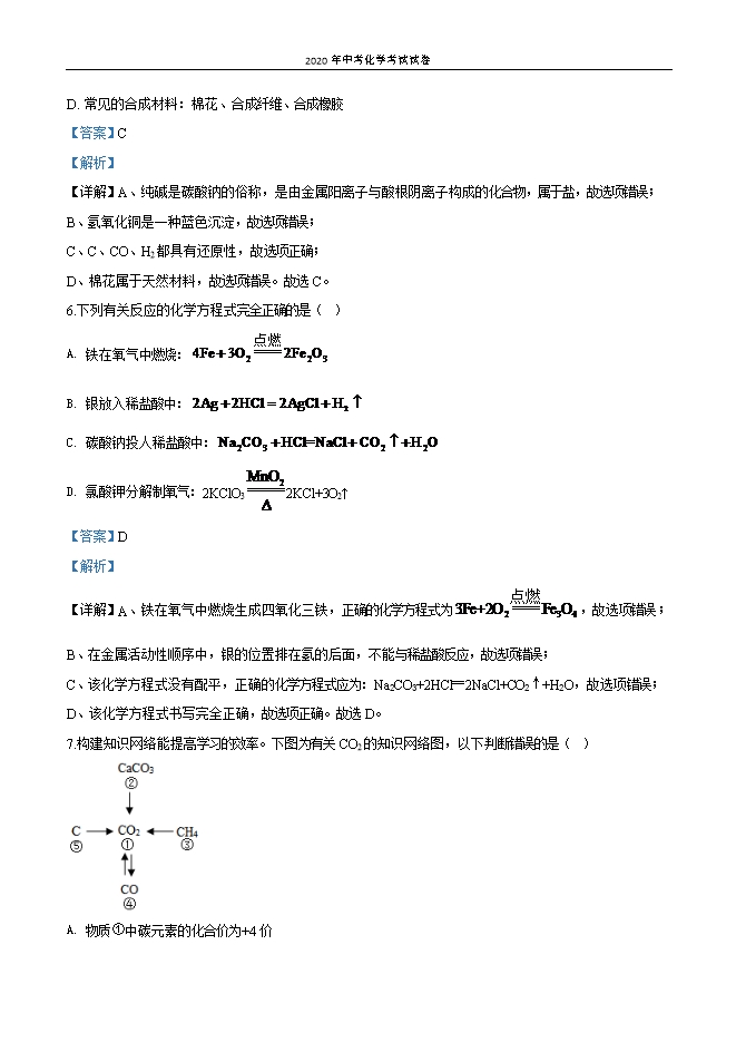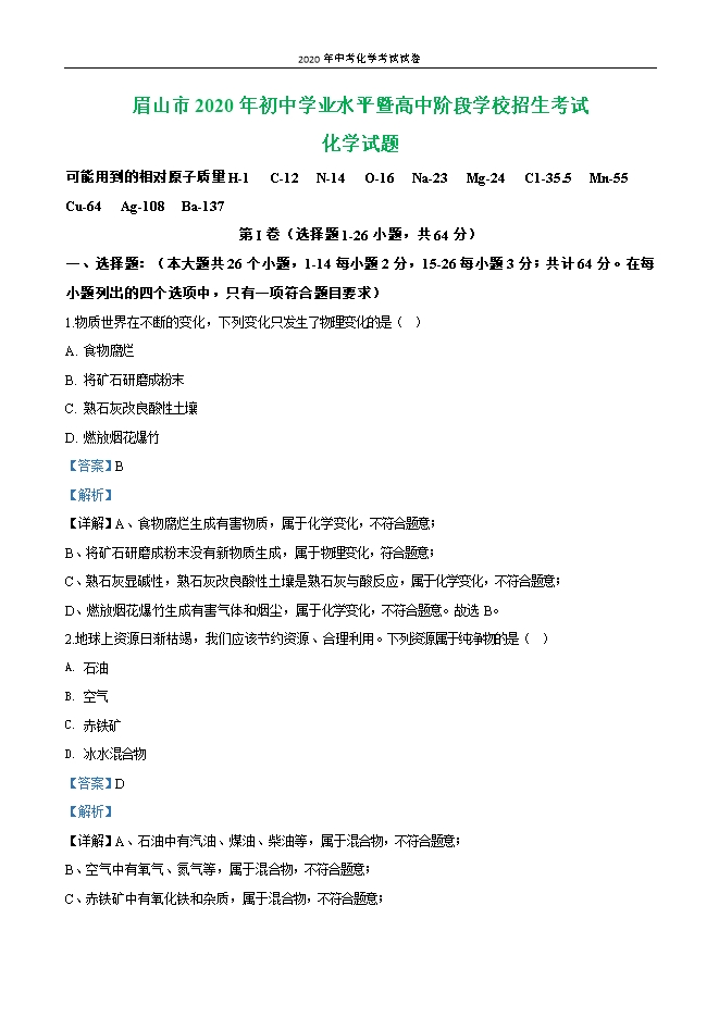 四川省眉山市2020年初中毕业学业统一考试化学试卷(解析版)