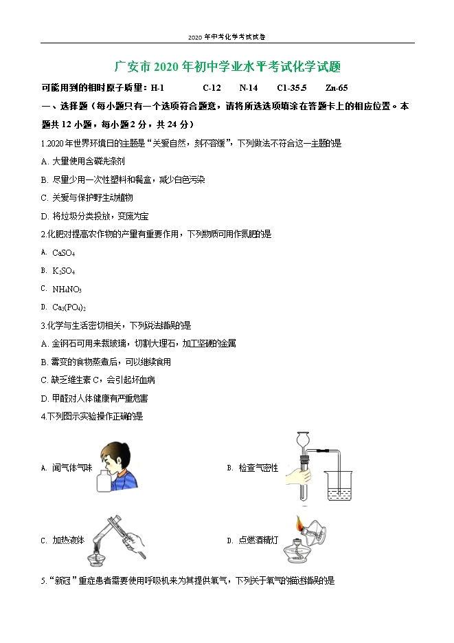 【内容简介】一、选择题(每小题只有一个选项符合题意,请将所选选项填涂在答题卡上的相应位置。本题共12小题,每小题2分,共24分)1.2020年世界环境日的主题是“关爱自然,刻不容缓”,下列做法不符合这一主题的是A. 大量使用含磷洗涤剂B. 尽量少用一次性塑料和餐盒,减少白色污染C. 关爱与保护野生动植物D. 将垃圾分类投放,变废为宝2.化肥对提高农作物的产量有重要作用,下列物质可用作氮肥的是A. CaSO4B. K2SO4C. NH4NO3D. Ca3(PO4)23.化学与生活密切相关,下列说法错误的是A. 金钢石可用来裁玻璃,切割大理石,加工坚硬的金属B. 霉变的食物蒸煮后,可以继续食用C. 缺乏维生素C,会引起坏血病D. 甲醛对人体健康有严重危害4.下列图示实验操作正确的是.......