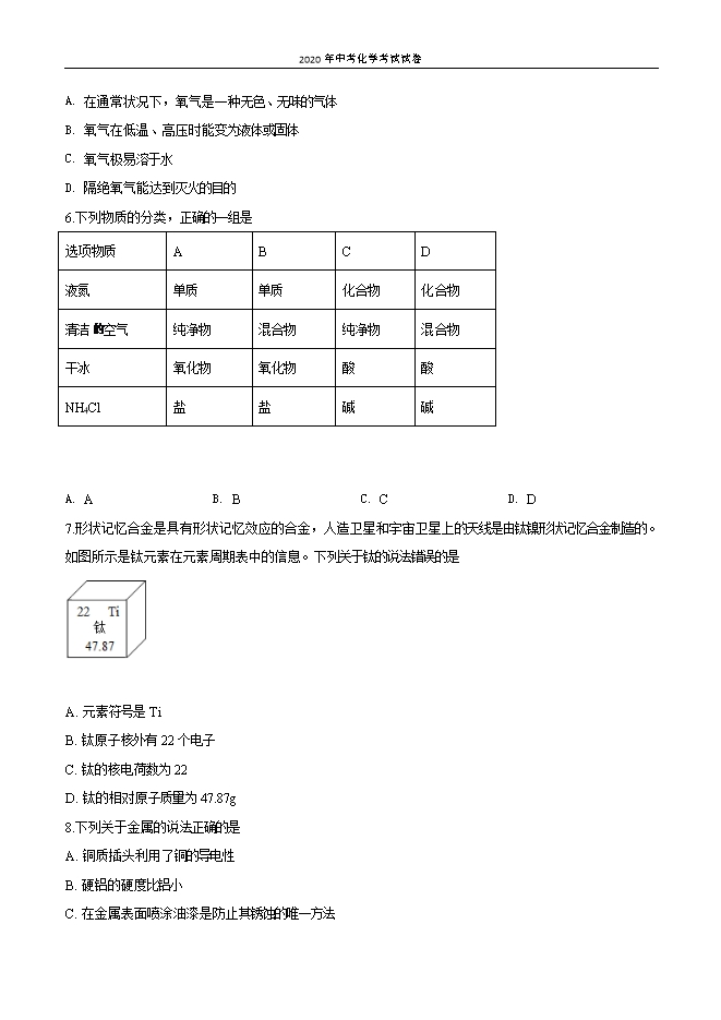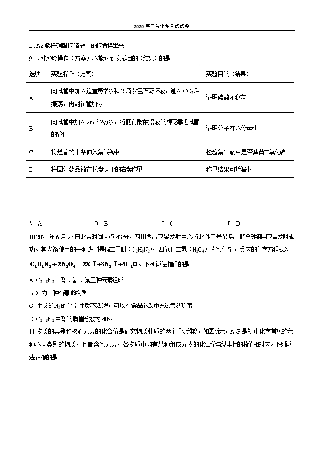 四川省广安市2020年初中毕业学业统一考试化学试卷(原卷版)