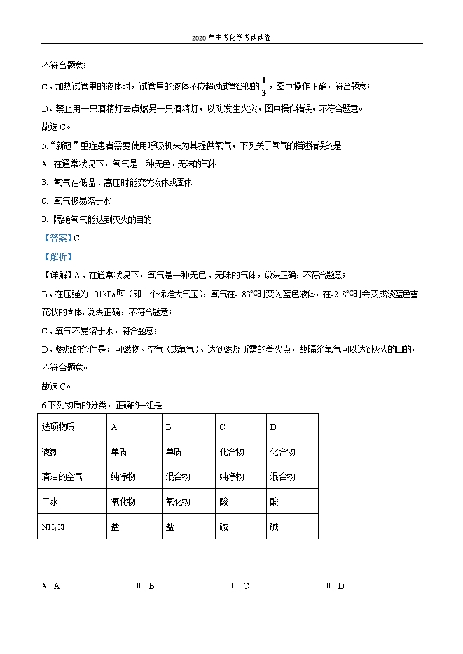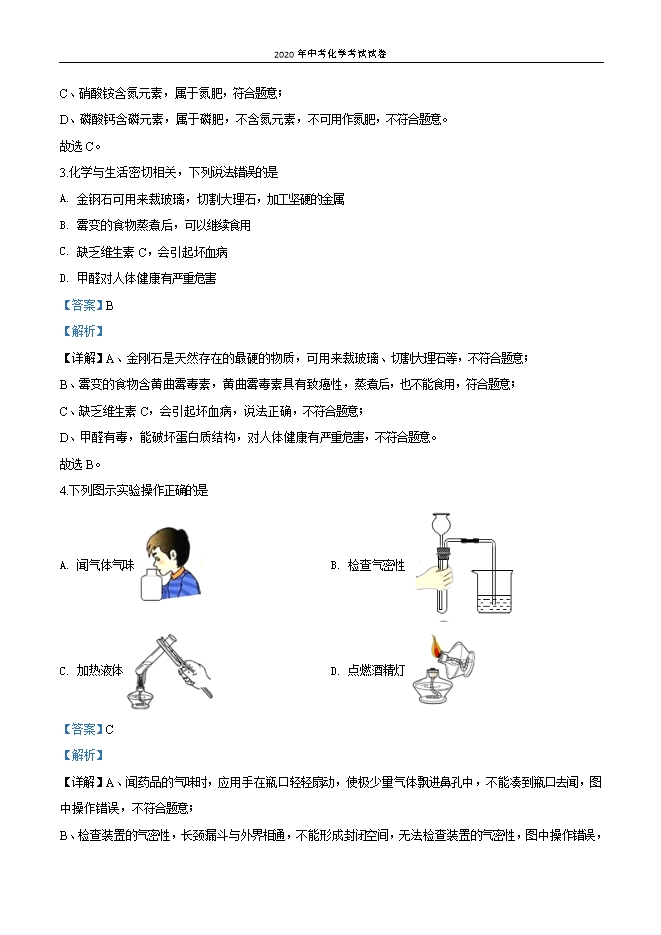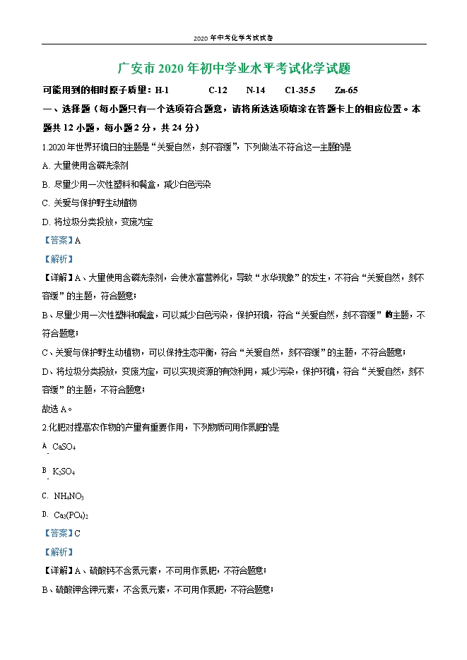 【内容简介】一、选择题(每小题只有一个选项符合题意,请将所选选项填涂在答题卡上的相应位置。本题共12小题,每小题2分,共24分)1.2020年世界环境日的主题是“关爱自然,刻不容缓”,下列做法不符合这一主题的是A. 大量使用含磷洗涤剂B. 尽量少用一次性塑料和餐盒,减少白色污染C. 关爱与保护野生动植物D. 将垃圾分类投放,变废为宝【答案】A【解析】【详解】A、大量使用含磷洗涤剂,会使水富营养化,导致“水华现象”的发生,不符合“关爱自然,刻不容缓”的主题,符合题意;B、尽量少用一次性塑料和餐盒,可以减少白色污染,保护环境,符合“关爱自然,刻不容缓” 主题,不符合题意;C、关爱与保护野生动植物,可以保持生态平衡,符合“关爱自然,刻不容缓”的主题,不符合题意;D、将垃圾分类投放,变废为宝,可以实现资源的有效利用,减少污染,保护环境,符合“关爱自然,刻不容缓”的主题,不符合题意;故选A。2.化肥对提高农作物的产量有重要作用,下列物质可用作氮肥的是A CaSO4B K2SO4C. NH4NO3D. Ca3(PO4)2【答案】C【解析】【详解】A、硫酸钙不含氮元素,不可用作氮肥,不符合题意;B、硫酸钾含钾元素,不含氮元素,不可用作氮肥,不符合题意;......