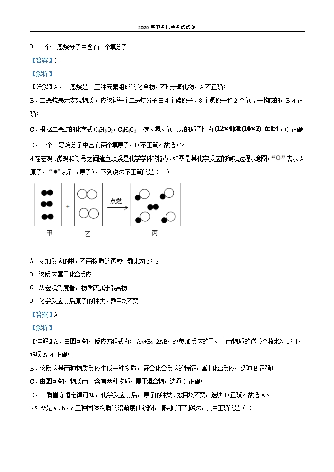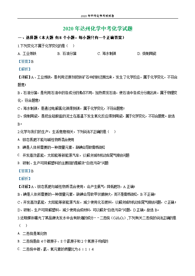 【内容简介】一、选择题(本大题 有8个小题,每小题只有一个正确答案)1.下列变化不属于化学变化的是( )A. 工业炼铁B. 石油分馏C. 海水制镁D. 烧制陶瓷【答案】B【解析】【详解】A、工业炼铁,是利用还原剂把铁矿石中的铁还原出来,发生了化学反应,属于化学变化,不符合题意; B、石油分馏,是利用石油中的各成分的沸点不同,加热蒸发石油,使石油中各成分分离出来,属于物理变化,符合题意; C、海水制镁,是通过电解氯化镁得到镁,属于化学变化,不符合题意; D、烧制陶瓷,是把含硅酸盐的泥土在高温下发生氧化反应得到陶瓷,属于化学变化,不符合题意。故选B。2.化学与我们的生产,生活息息相关,下列说法不正确的是( )A. 铵态氮肥不能与碱性物质混合使用B. 碘是人体所需要的一种微量元素,缺碘会导致骨质疏松C. 开发高效氢能,太阳能等新能源汽车,以解决城市机动车尾气排放问题D. 研制、生产可降解塑料的主要目的是解决“白色污染”问题【答案】B【解析】【详解】A、铵态氮肥与碱性物质混合使用,会产生氨气,降低肥效,A正确;B、碘是人体所需要的一种微量元素,缺碘会导致甲状腺肿大,而不是骨质疏松,B不正确;C、开发高效氢能,太阳能等新能源汽车,减少使用化石燃料,以解决城市机动车尾气排放问题,C正确;D、研制、生产可降解塑料,减少使用合成材料,可以解决“白色污染”问题,D正确。故选B。3.近期媒体曝光了某品牌洗发水中含有致癌的成分--二恶烷(C4H8O2),下列有关二恶烷的说法正确的是( )A. 二恶烷是氧化物B. 二恶烷是由4个碳原子、8个氢原子和2个氧原子构成的C. 二恶烷中碳、氢、氧元素的质量比为6 :1 :4D. 一个二恶烷分子中含有一个氧分子【答案】C【解析】......