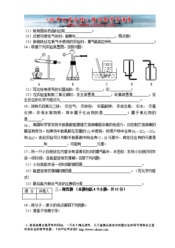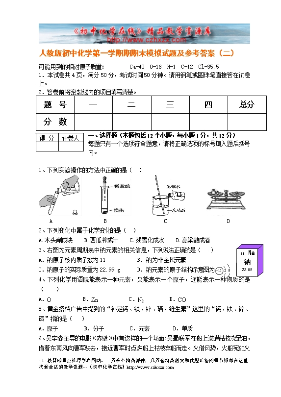 - 下一份试卷:人教版初中化学第一学期期期末模拟试题及参考答案(三)