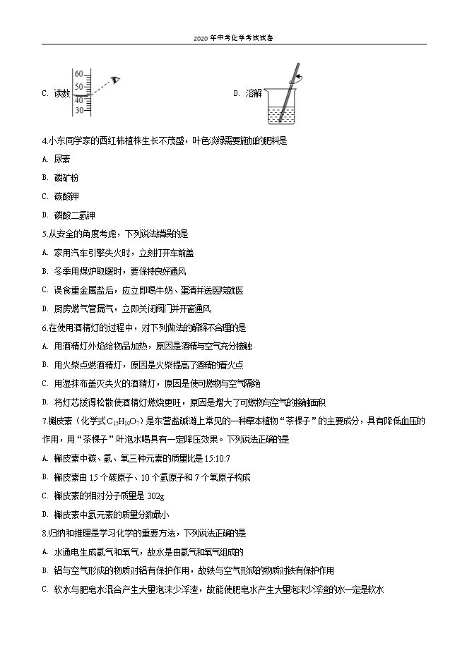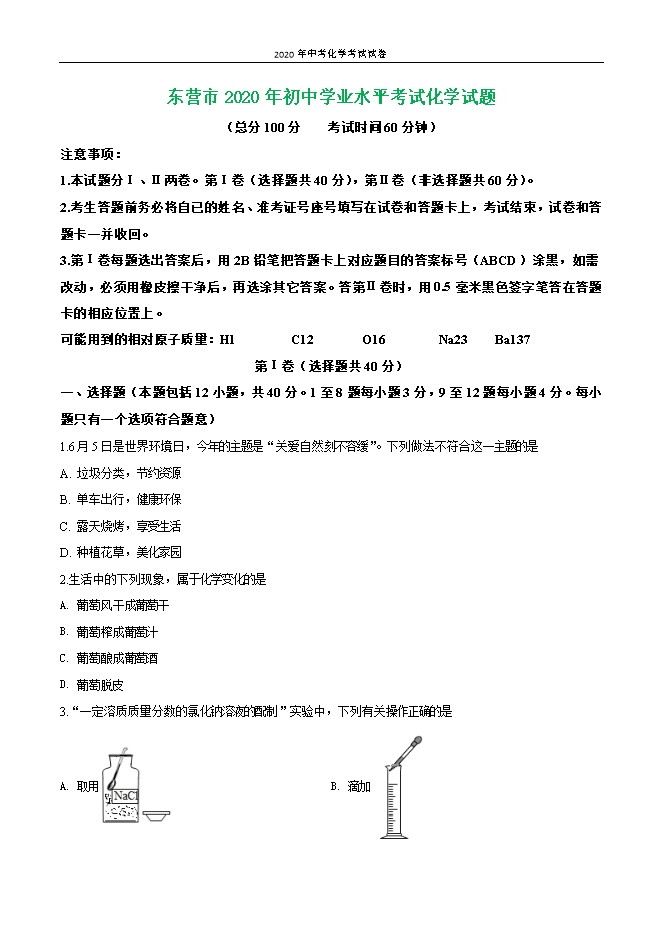 【内容简介】一、选择题(本题包括12小题,共40分。1至8题每小题3分,9至12题每小题4分。每小题只有一个选项符合题意)1.6月5日是世界环境日,今年的主题是“关爱自然刻不容缓”。下列做法不符合这一主题的是A. 垃圾分类,节约资源B. 单车出行,健康环保C. 露天烧烤,享受生活D. 种植花草,美化家园2.生活中的下列现象,属于化学变化的是A. 葡萄风干成葡萄干B. 葡萄榨成葡萄汁C. 葡萄酿成葡萄酒D. 葡萄脱皮3.“一定溶质质量分数的氯化钠溶液的配制”实验中,下列有关操作正确的是A. 取用 B. 滴加 C. 读数 D. 溶解 4.小东同学家的西红柿植株生长不茂盛,叶色淡绿需要施加的肥料是A. 尿素B. 磷矿粉C. 碳酸钾D. 磷酸二氢钾5.从安全的角度考虑,下列说法错误的是A. 家用汽车引擎失火时,立刻打开车前盖B. 冬季用煤炉取暖时,要保持良好通风C. 误食重金属盐后,应立即喝牛奶、蛋清并送医院就医D. 厨房燃气管漏气,立即关闭阀门并开窗通风6.在使用酒精灯的过程中,对下列做法的解释不合理的是A. 用酒精灯外焰给物品加热,原因是酒精与空气充分接触B. 用火柴点燃酒精灯,原因是火柴提高了酒精的着火点C. 用湿抹布盖灭失火的酒精灯,原因是使可燃物与空气隔绝D. 将灯芯拨得松散使酒精灯燃烧更旺,原因是增大了可燃物与空气的接触面积7.槲皮素(化学式C15H10O7)是东营盐碱滩上常见的一种草本植物“茶棵子”的主要成分,具有降低血压的作用,用“茶棵子”叶泡水喝具有一定降压效果。下列说法正确的是......