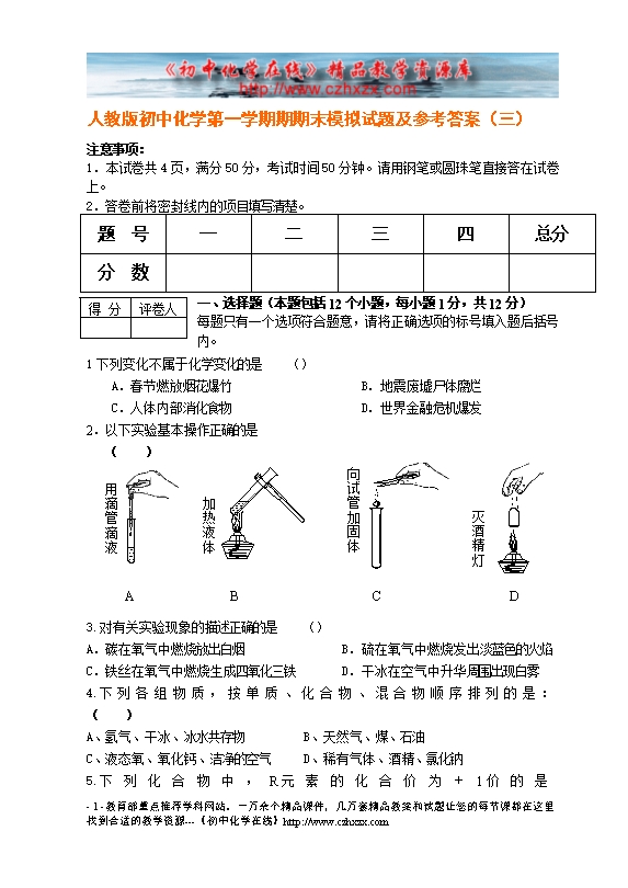 人教版初中化学第一学期期期末模拟试题及参考答案(三)