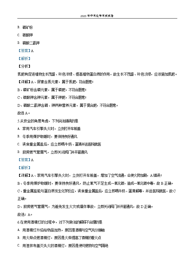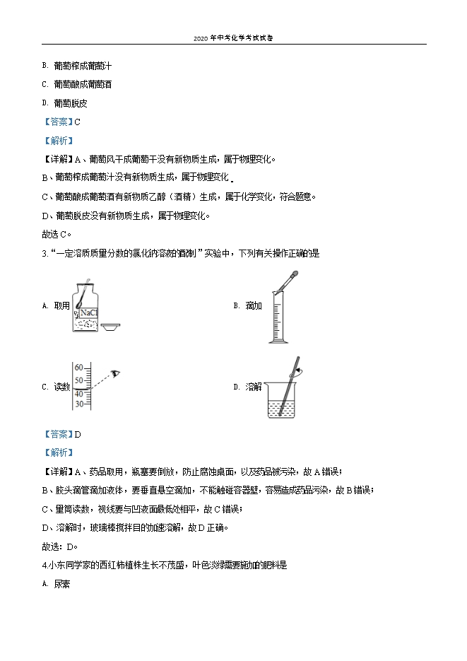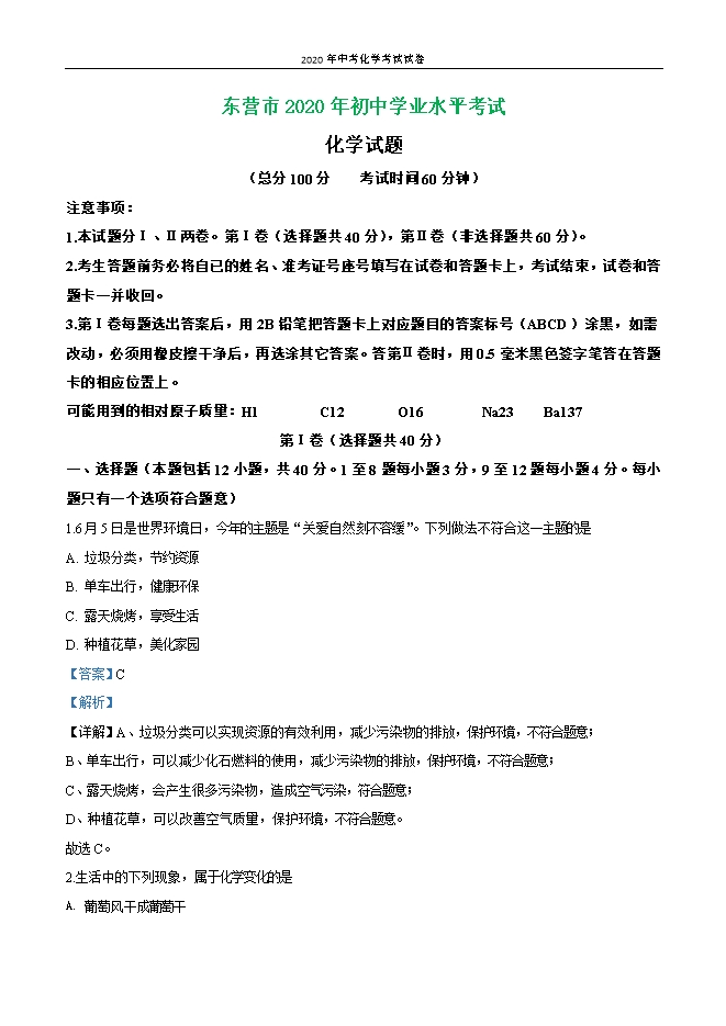 【内容简介】一、选择题(本题包括12小题,共40分。1至8题每小题3分,9至12题每小题4分。每小题只有一个选项符合题意)1.6月5日是世界环境日,今年的主题是“关爱自然刻不容缓”。下列做法不符合这一主题的是A. 垃圾分类,节约资源B. 单车出行,健康环保C. 露天烧烤,享受生活D. 种植花草,美化家园【答案】C【解析】【详解】A、垃圾分类可以实现资源的有效利用,减少污染物的排放,保护环境,不符合题意;B、单车出行,可以减少化石燃料的使用,减少污染物的排放,保护环境,不符合题意;C、露天烧烤,会产生很多污染物,造成空气污染,符合题意;D、种植花草,可以改善空气质量,保护环境,不符合题意。故选C。2.生活中的下列现象,属于化学变化的是A. 葡萄风干成葡萄干B. 葡萄榨成葡萄汁C. 葡萄酿成葡萄酒D. 葡萄脱皮【答案】C【解析】【详解】A、葡萄风干成葡萄干没有新物质生成,属于物理变化。B、葡萄榨成葡萄汁没有新物质生成,属于物理变化 C、葡萄酿成葡萄酒有新物质乙醇(酒精)生成,属于化学变化,符合题意。D、葡萄脱皮没有新物质生成,属于物理变化。故选C。3.“一定溶质质量分数的氯化钠溶液的配制”实验中,下列有关操作正确的是......