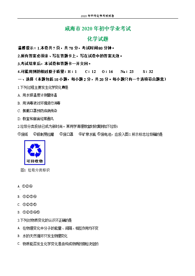 山东省咸海市2020年初中毕业学业统一考试化学试卷(原卷版)